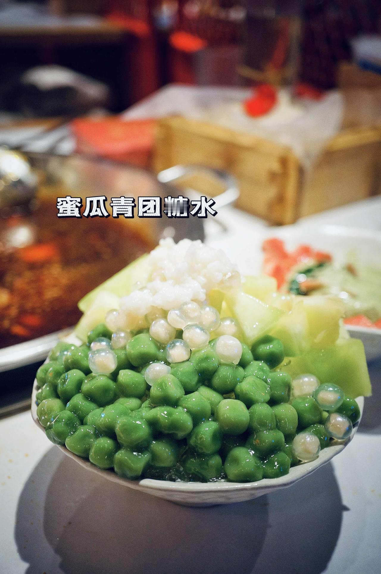 🍈 蜜瓜青团糖水:这个搭配太妙了!新鲜蜜瓜的清甜+糯叽叽的青团+滑嫩的冰豆花,一口下去绵软又Q弹,完全是春天的味道,吃完火锅来一碗特别解辣。