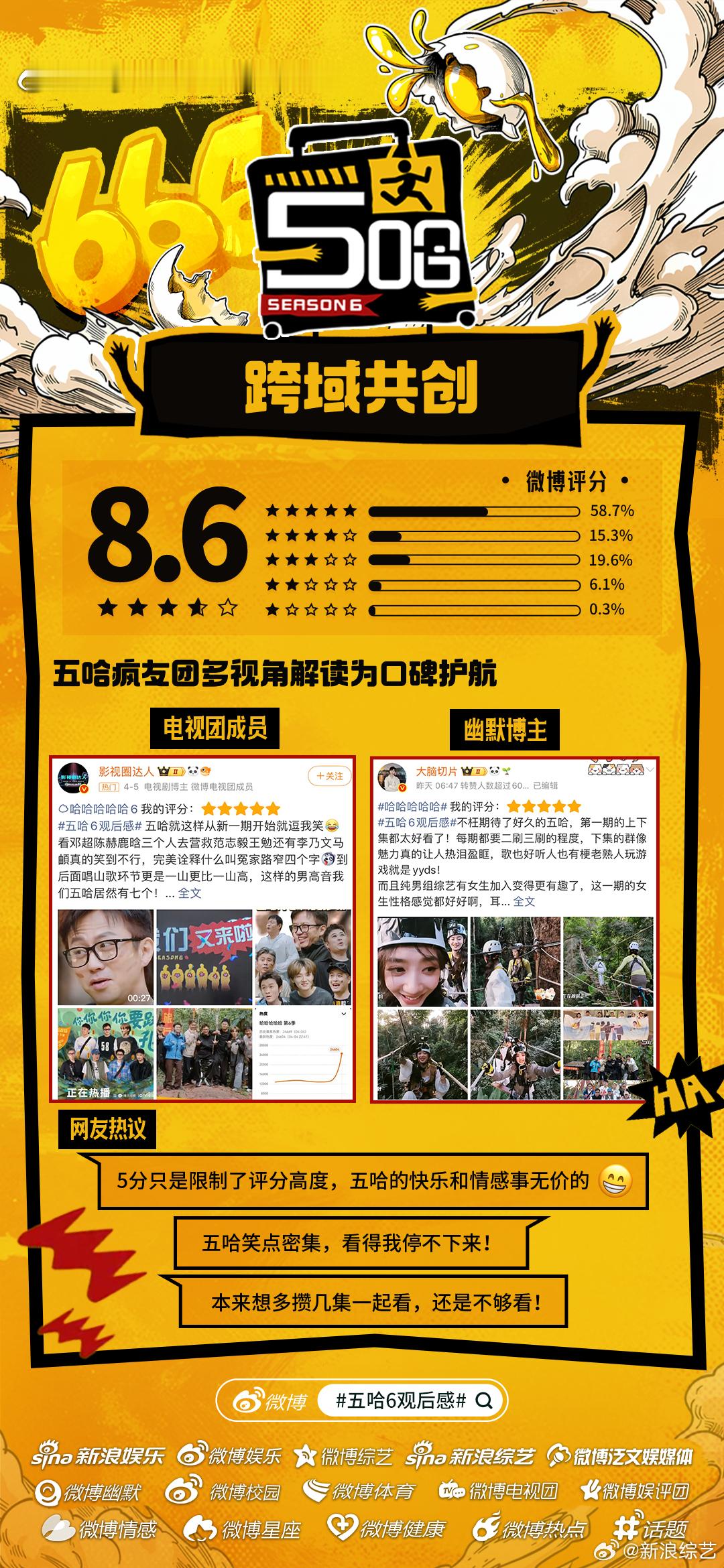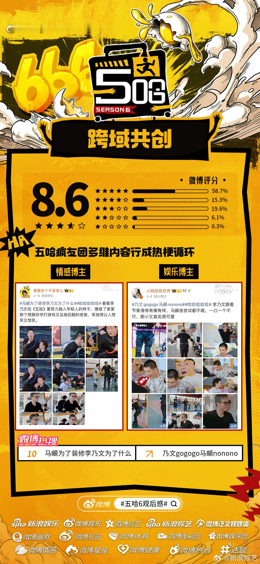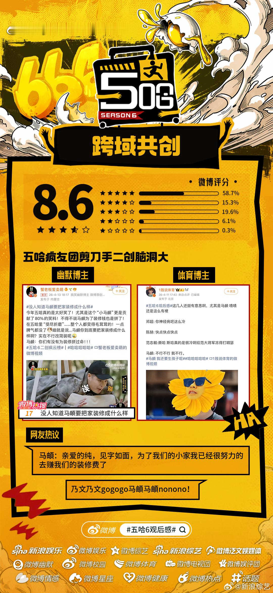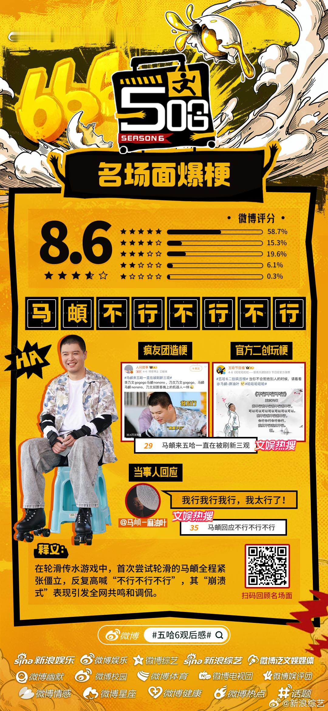 五哈6微博开分8.6《哈哈哈哈哈6》微博开分8.6主创营业花式整活儿陪伴哈友追综,“李乃文进行曲”、“马頔不行不行不行”等名场面频出,更有官方下场助推热梗!媒体加持、疯友团共创、自来水安利……五哈6哪个名场面令你印象深刻?