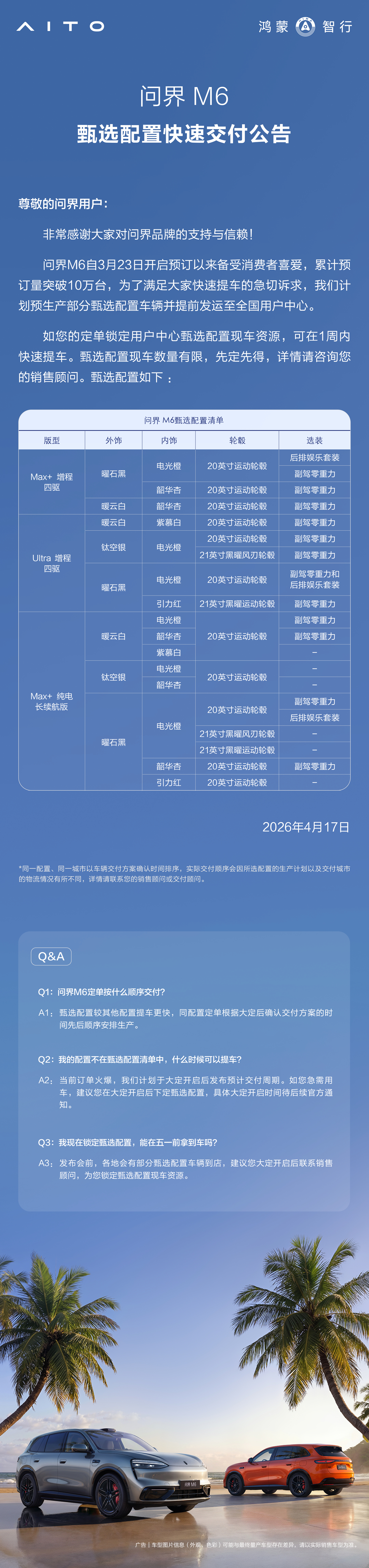 问界M6下周正式上市,也会开启交付。这会官方也给出了甄选配置,最快可以一周提车,快看看有没有你想要的,可以联系销售改上配置到时候加快提车。预售开启差不多一个月,预订突破了10万台。如果有合适的甄选配置,到时候锁单之后就可以快速提上,开上新车美滋滋。不然估计还会有得等,这车也是很受关注。祝大家五一之前开上新车~问界M6最快可一周提车