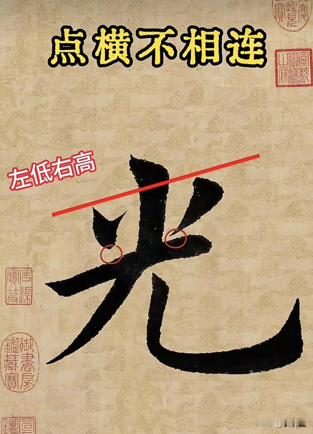 ❹点横不相连:写带爪字头的字时,上面的左右两个点不要和下面的横画碰到,而且右边的点稍微高一点,这样写出来更美观。硬笔字练字方法 写字方法技巧 书法速成方法 斜捺必练连笔字 练字 分享写字乐趣