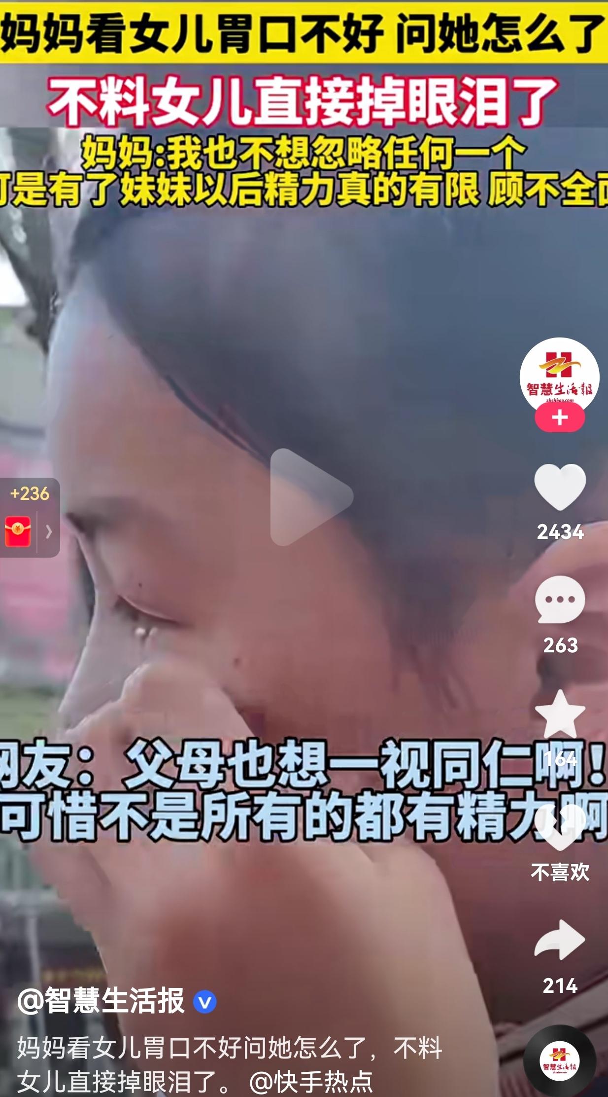 妈妈事后也特别无奈,她说自己也不想忽略任何一个孩子,可带小的已经耗光了她所有的力气,真的顾不全面。镜头里,孩子的眼泪砸在饭桌上,也砸在了无数二胎家庭的心上。