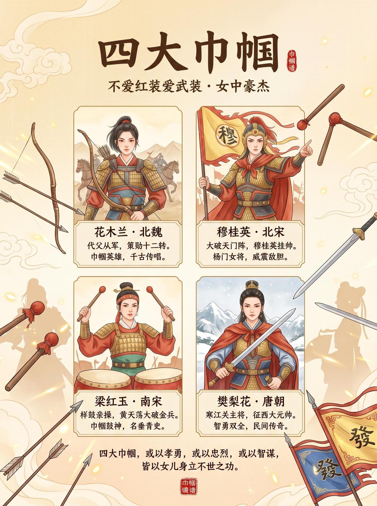 ✅ 四大巾帼:不爱红装爱武装,她们以女儿身立不世之功,用勇气打破 “女子不如男” 的偏见。
