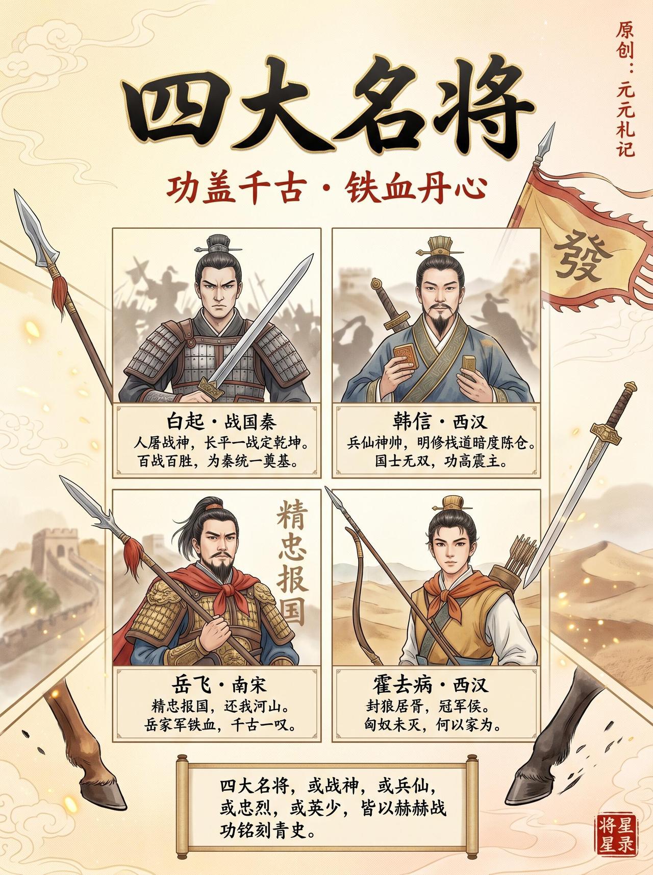✅ 四大名将:功盖千古、铁血丹心,他们身披铠甲,以血肉之躯护山河无恙,撑起王朝的脊梁。