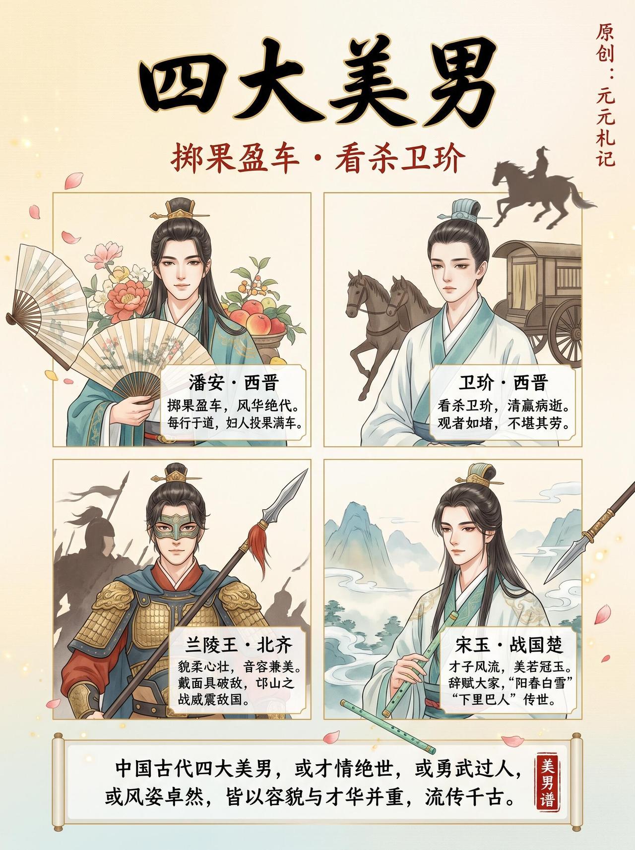 ✅ 四大美男:掷果盈车、看杀卫玠,既有风华绝代的容貌,亦有惊才绝艳的才情。
