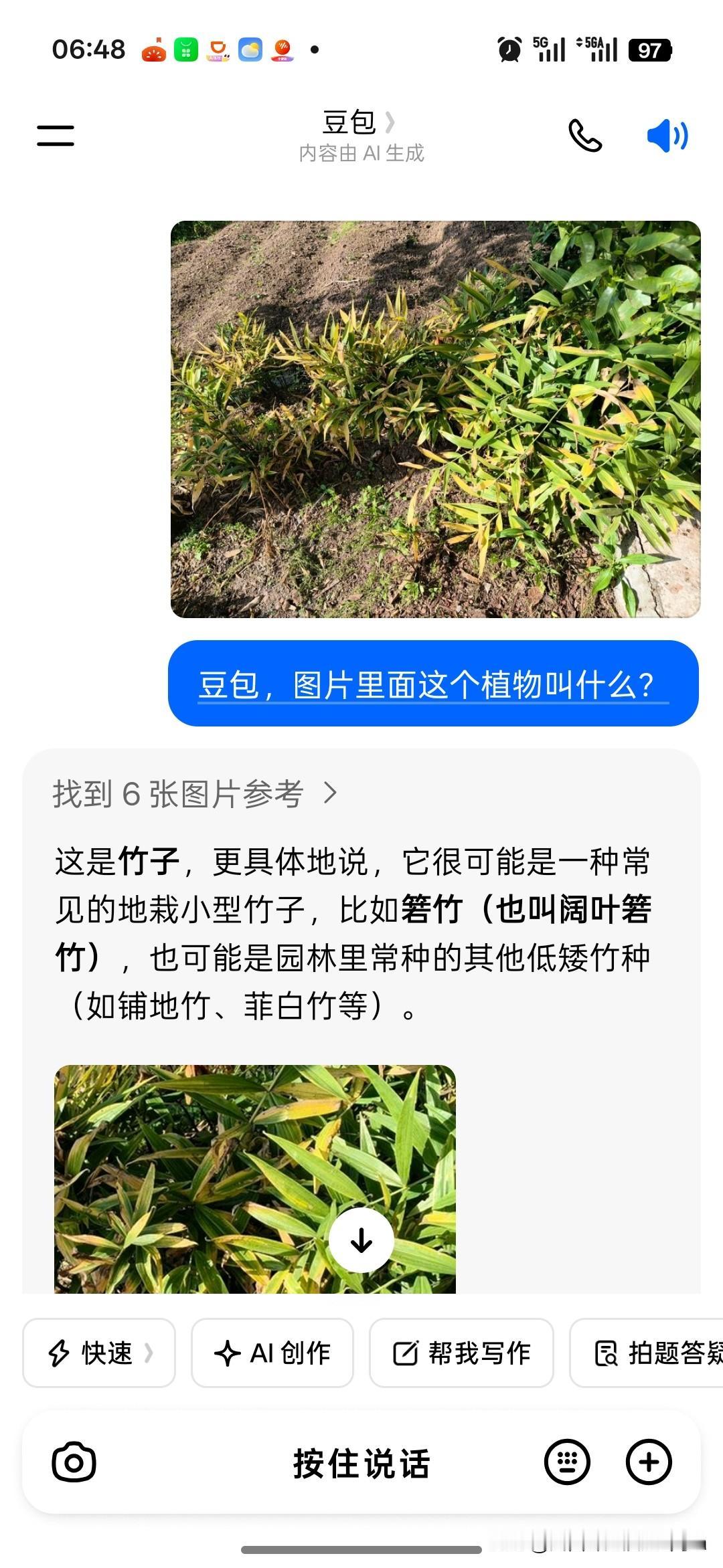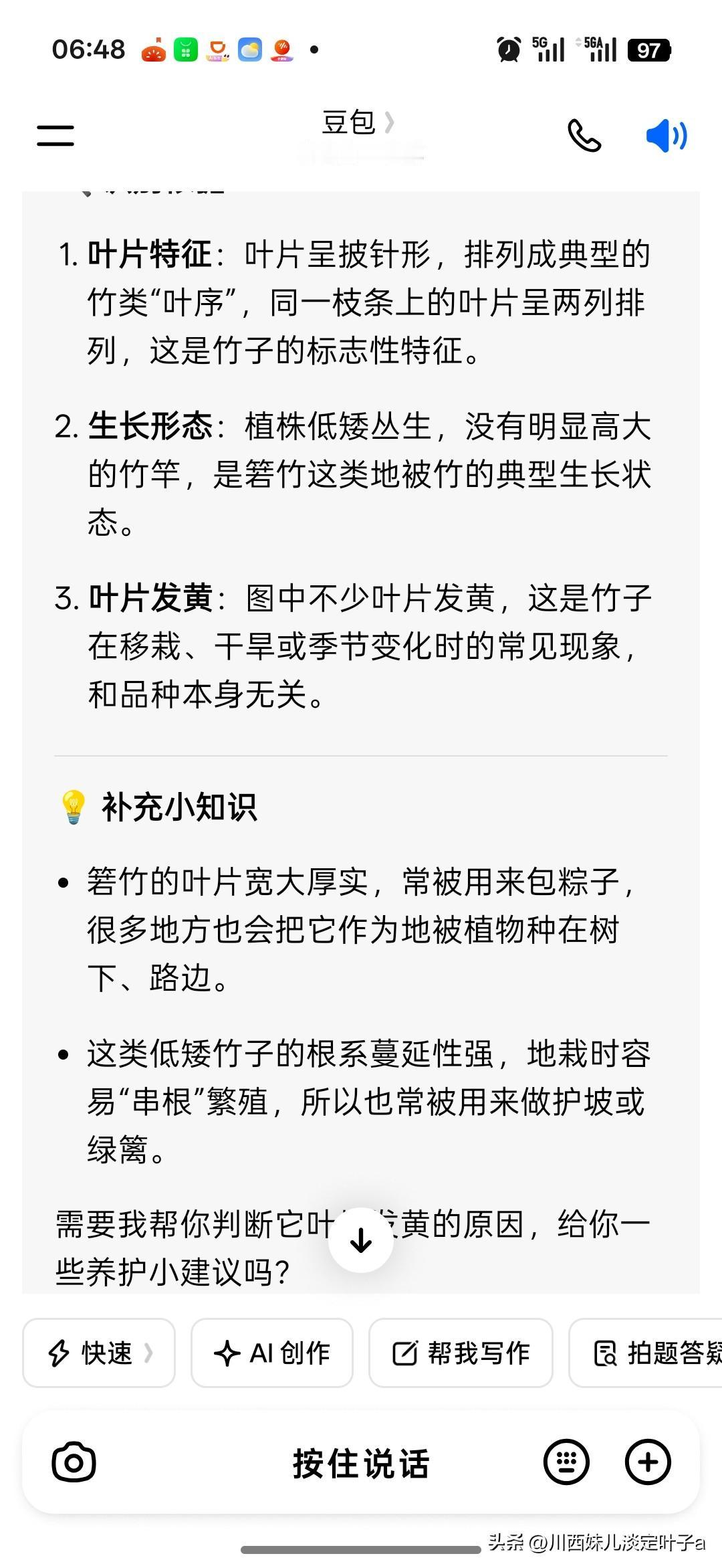 我刚才问豆包认识这个东西不?她说是竹子。哈哈