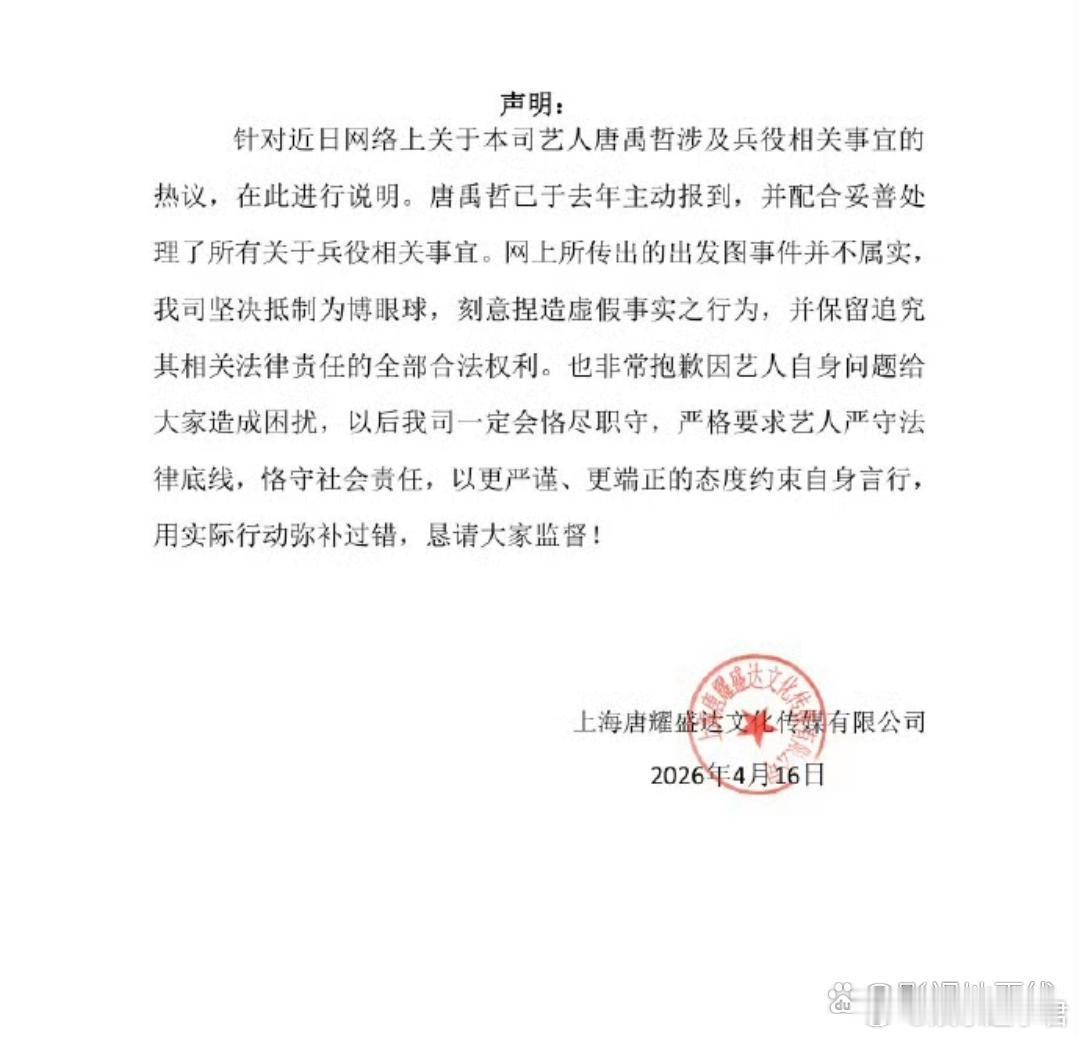 17日,唐禹哲工作室发声明回应兵役相关事宜的热议,唐禹哲已于去年主动报到,并配合妥善处理了所有关于兵役相关事宜。网上所传出的出发图事件并不属实,“我司坚决抵制为博眼球,刻意捏造虚假事实之行为,并保留追究其相关法律责任的全部合法权利。