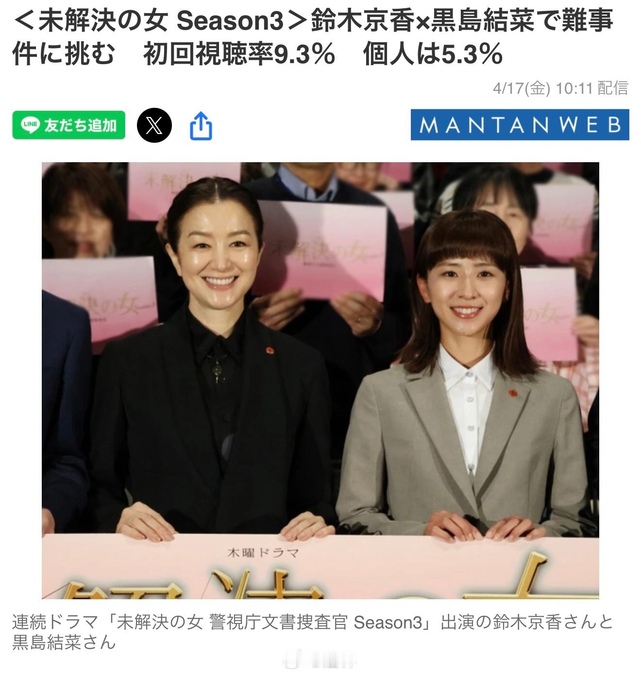 新剧开播:女演员铃木京香主演、黑岛结菜共同出演的朝日电视台木9连续剧『未解决之女 警视厅文书搜查官 第3季』第1集已于4月16日播出。据Video Research调查,第1集平均收视率为世代9.3%,个人5.3%。