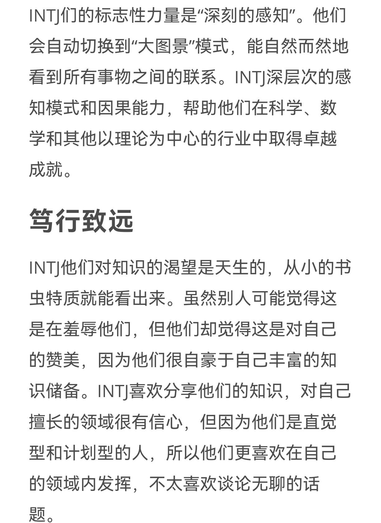 最近常常听别人说i人、e人之类的话题,我才忽然想起我前几年也去测试过,并且测试过好几次,结果都是intj。嗯嗯,确实符合自己的特征。