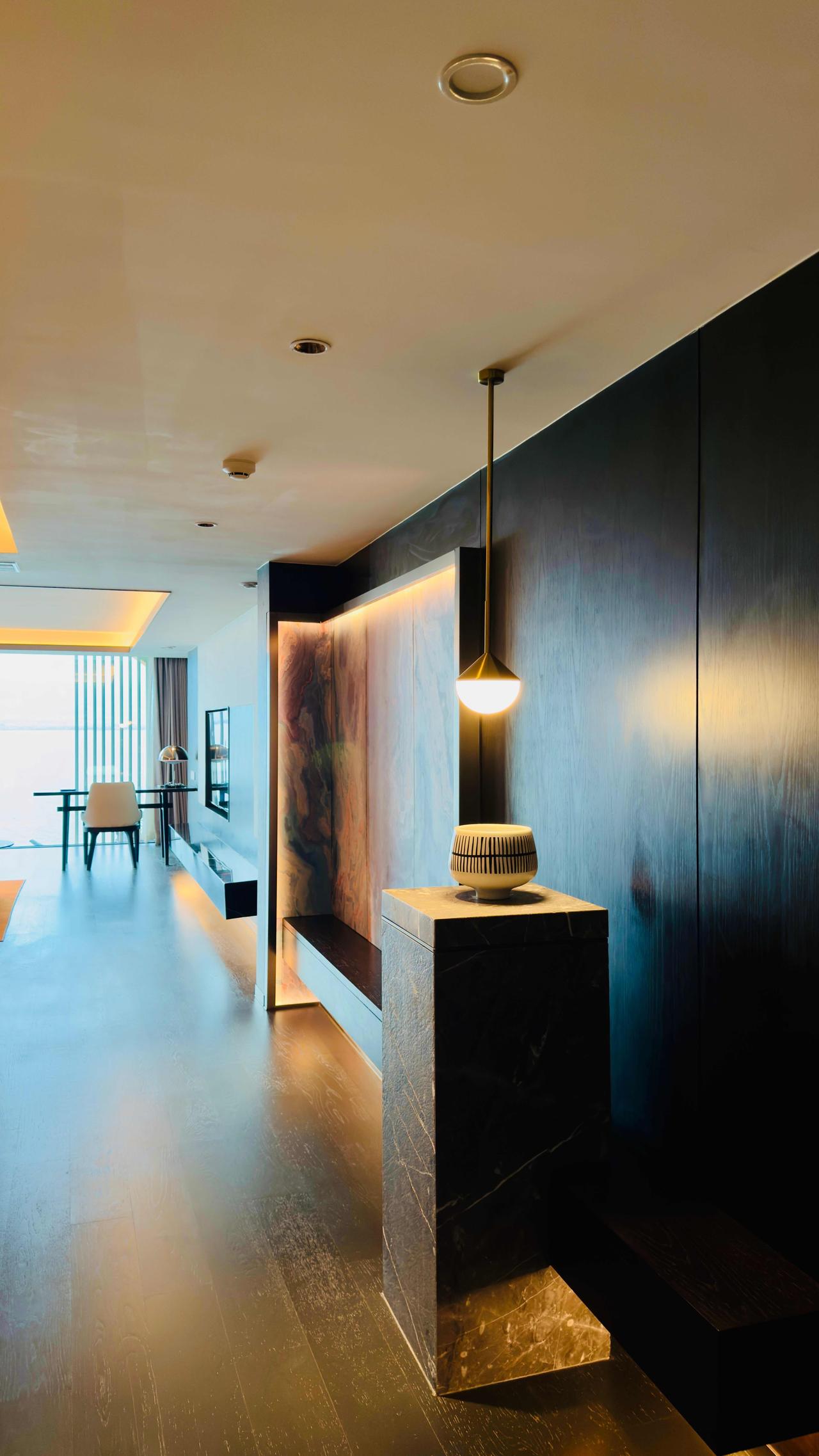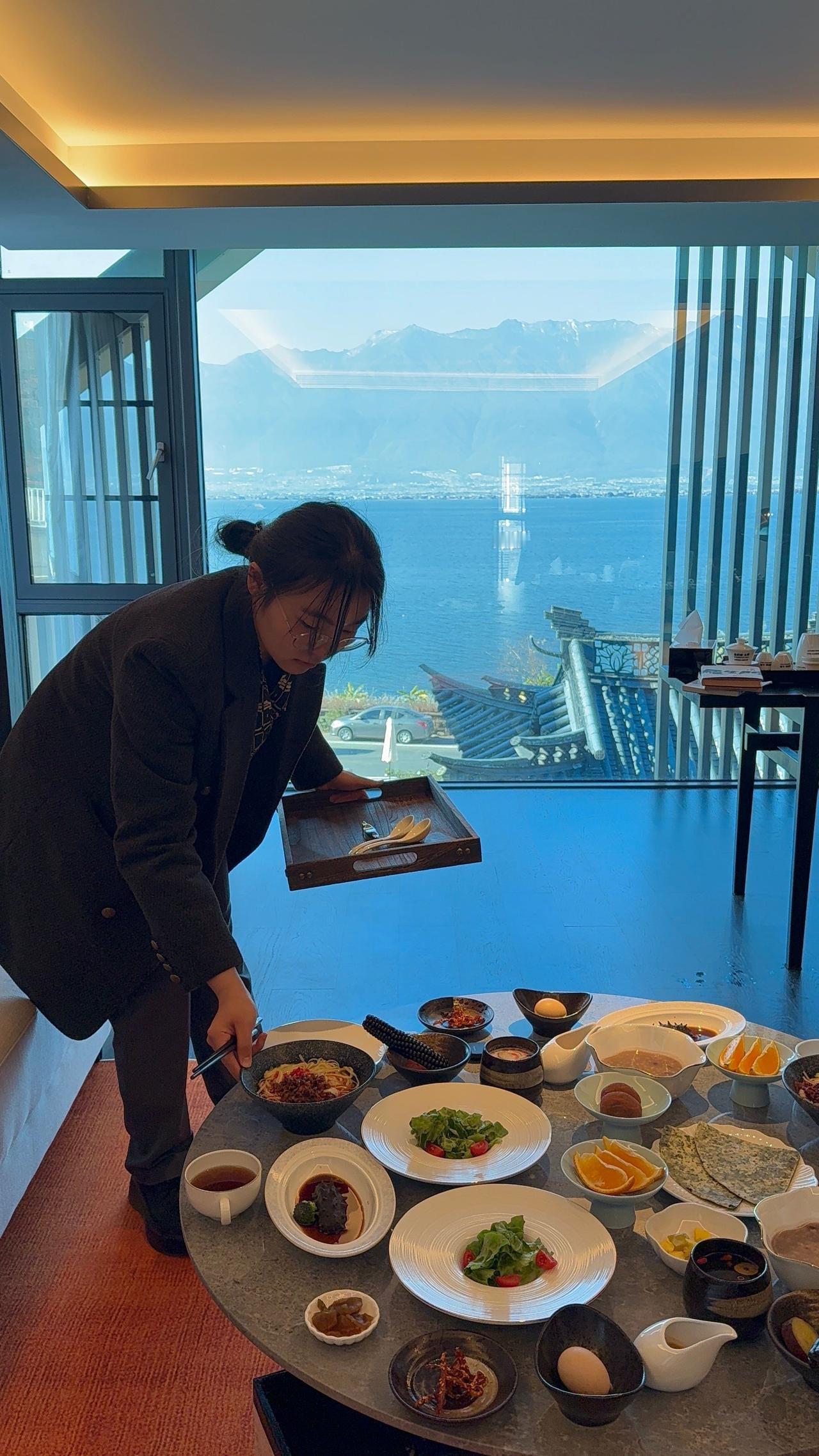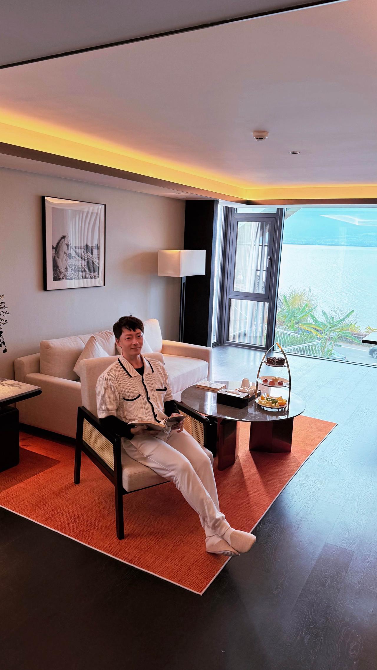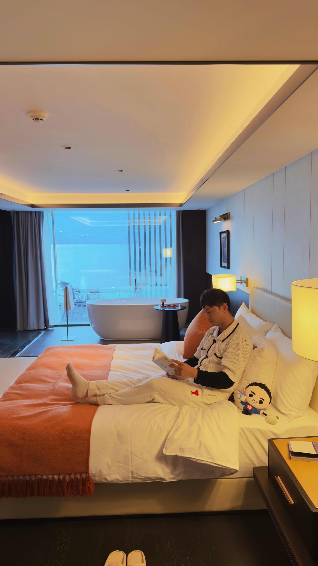 我住的房间很宽敞,落地窗正对着洱海,每天清晨,我都铺块瑜伽垫,伴着山风拉伸。床品是宝格丽同款,软乎乎的,浴室里的戴森吹风机、巴黎备品,都是悄悄藏着的用心,不张扬,却很妥帖。