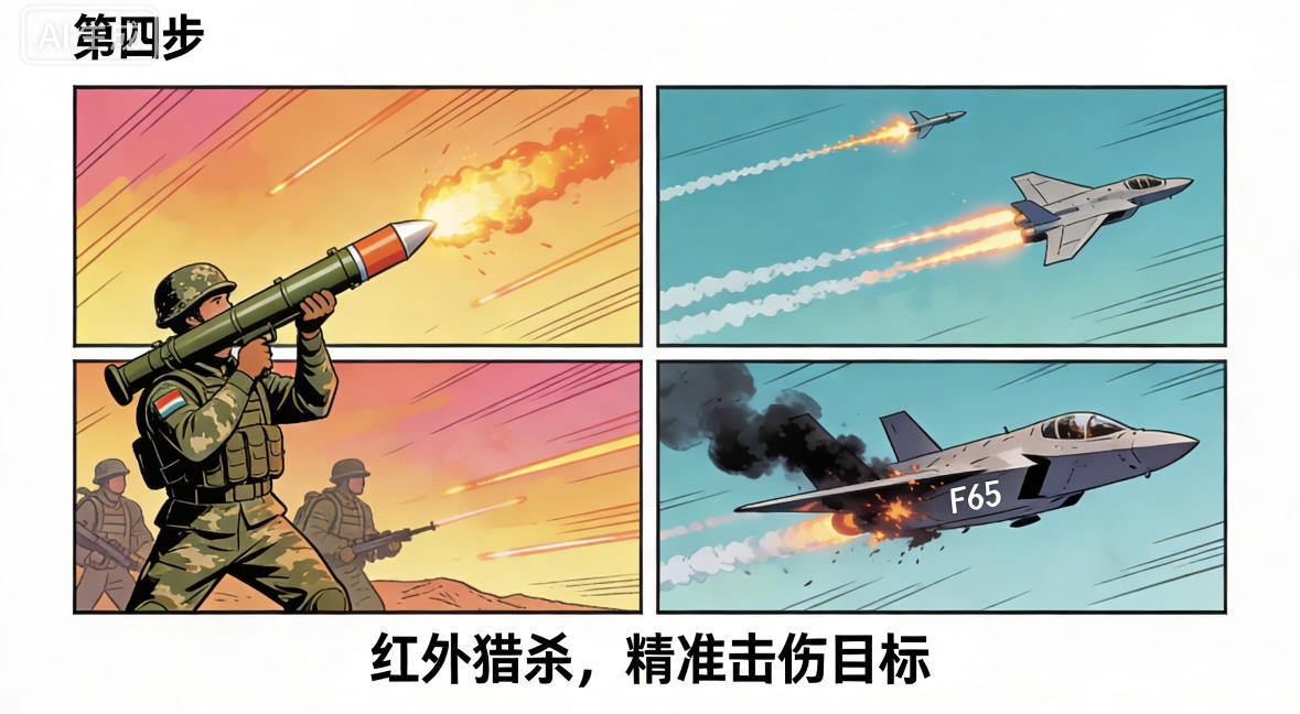 单兵肩扛式防空导弹发射,依靠追踪发动机热量的红外制导,精准击中战机,成功将F-35击伤。