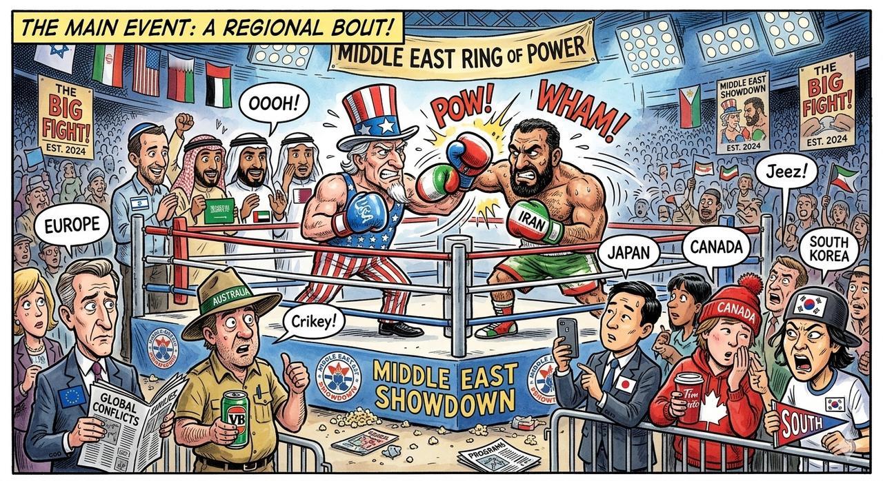 美国和伊朗拳击比赛,美国的拉拉队有以色列和海湾国家。美国的传统盟友都在观看,不当拉拉队。