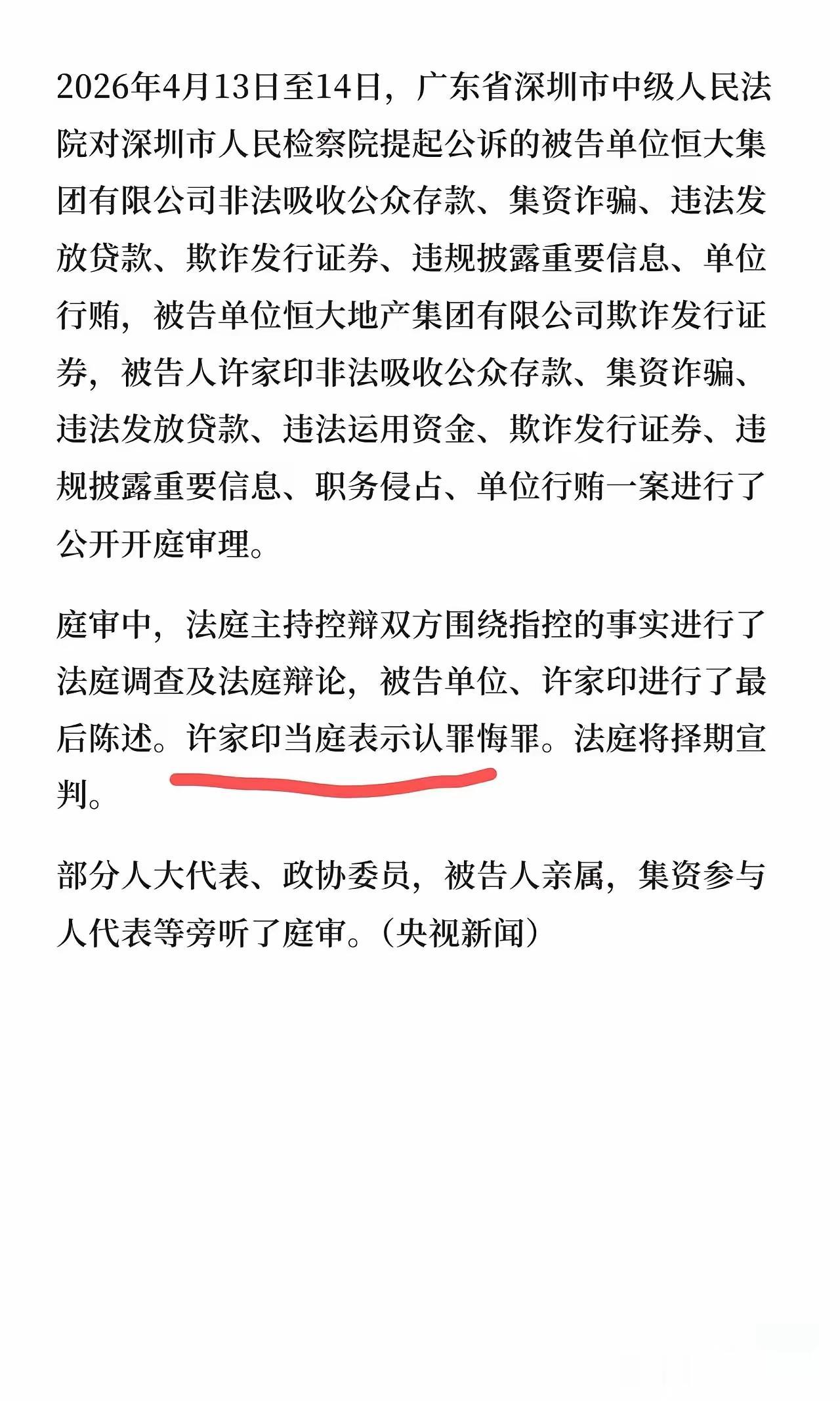 当年盛极一时的恒大地产集团轰然倒塌,公司高管抓的抓,散的散,树倒猢狲散,只留下荒郊野外的小区大门,买房付了钱却收不到房的业主,和欲哭无泪的被集资血本无归的员工们。近日,恒大集团及其领导许家印因非法集资,欺诈证券,职务侵占,行贿等案件进行公开审理,部分人大代表,集资受害者进行了旁听,许家印当庭表示认罪,不知道法庭上给许老板准备双响炮没。