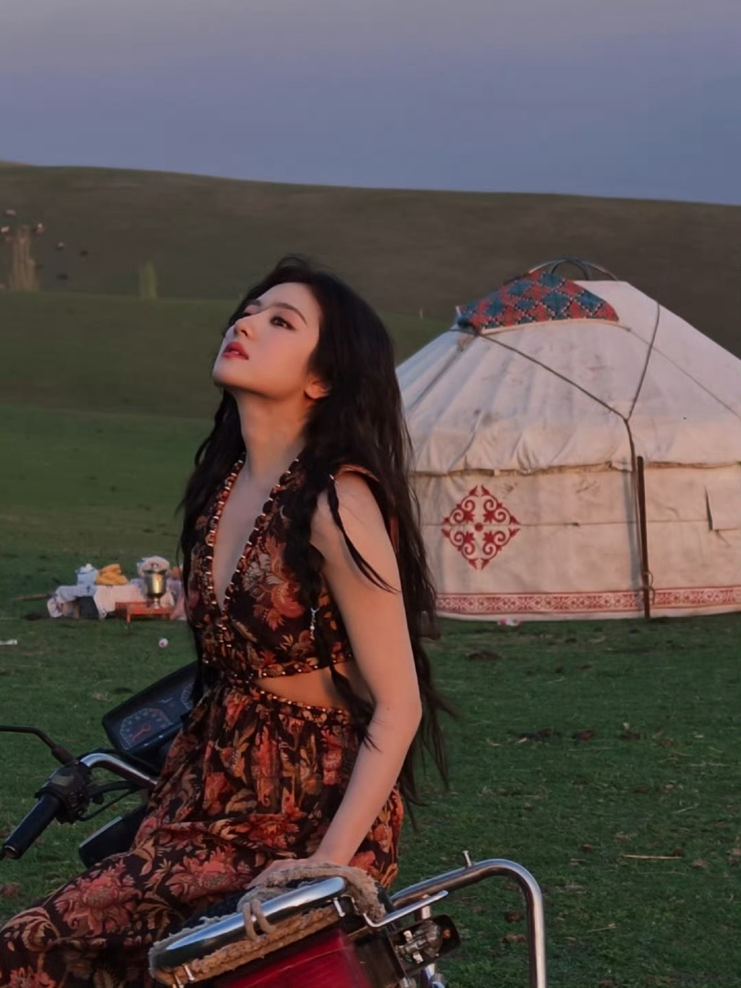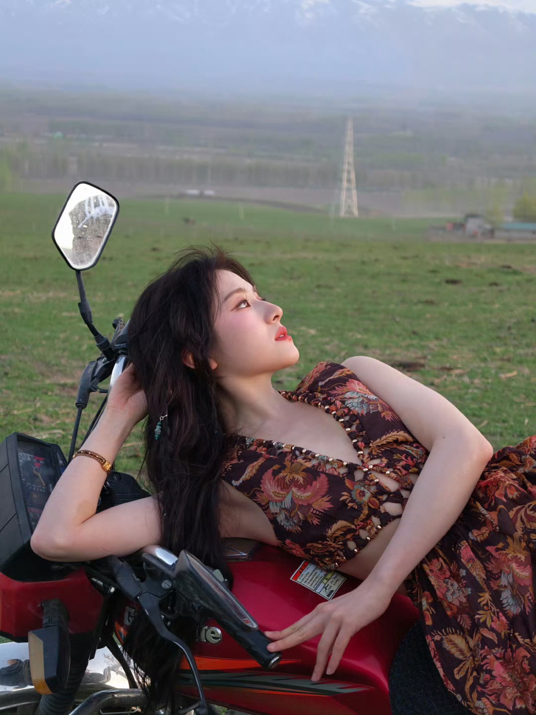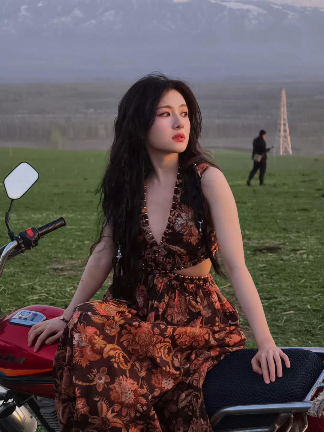 李兰迪公路文走出的女主李兰迪草原野玫瑰李兰迪草地搭配复古机车好美呀!温柔碎花与酷