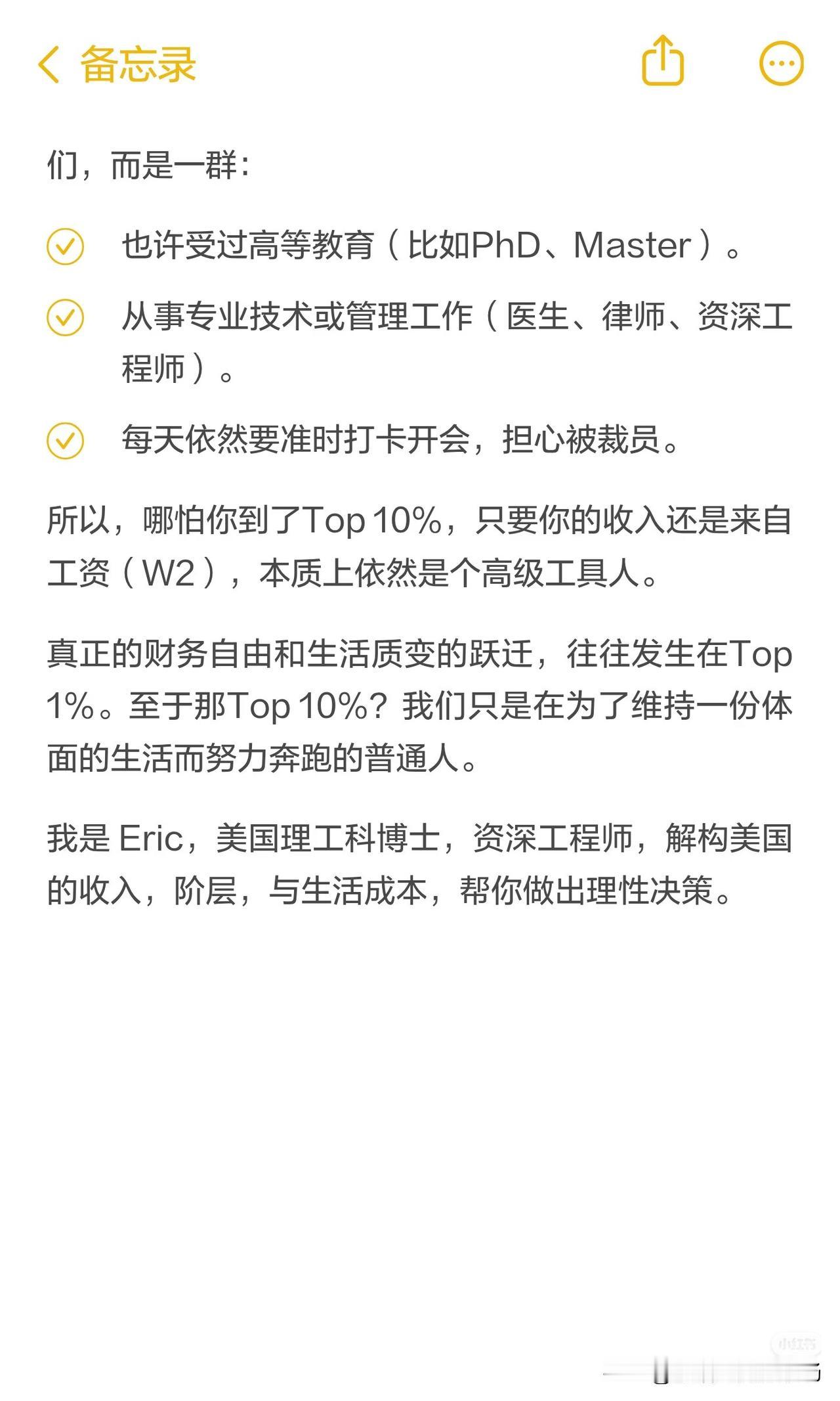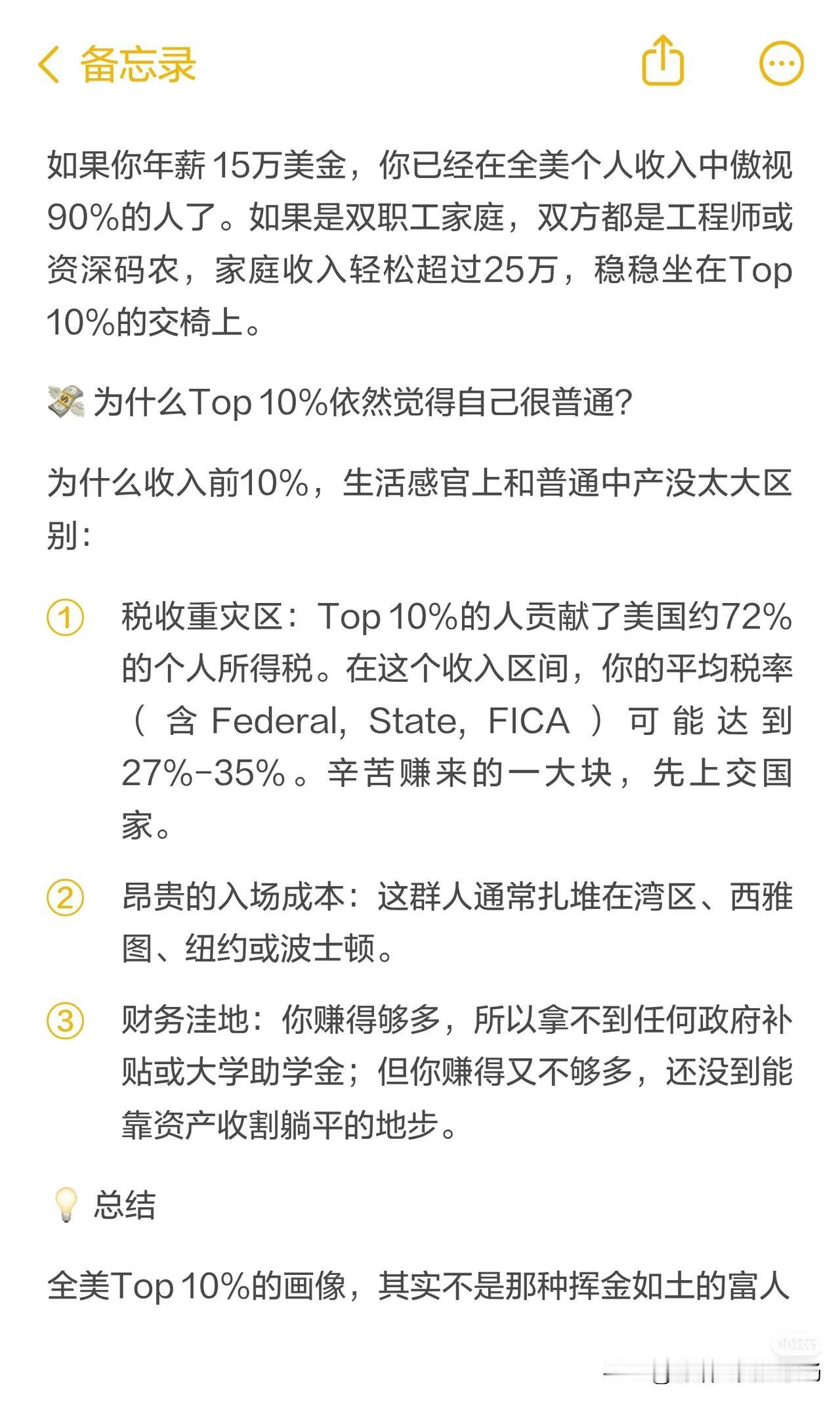 先看硬数据:美国个人年收入Top10%的门槛,也就15.5万美元;双职工家庭25万,就能稳稳坐在前10%的位置。这个数,湾区一个资深码农、纽约一个资深律师,或者波士顿一个名校医生,努努力就能摸到。但就是这群人,本质上还是个高级打工人。