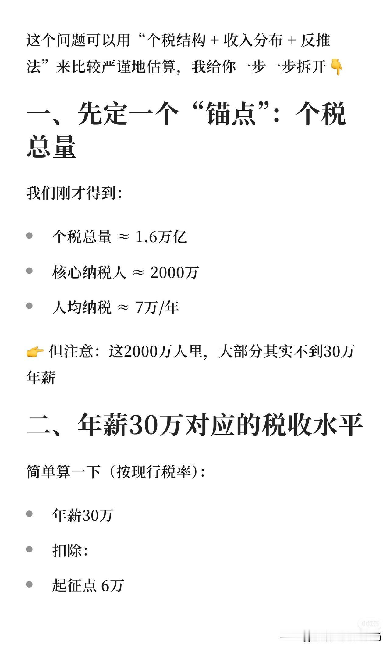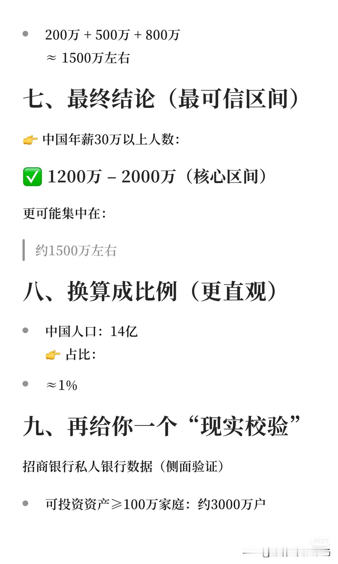 这个数不是拍脑袋算的,是用个税数据反推出来的。全国个税一年收1.6万亿,核心纳税人也就2000万,这里面大部分人年薪还不到30万。真正能摸到30万门槛的,刨去50万、100万以上的高收入群体,最后算下来也就1500万左右,刚好占总人口1%。