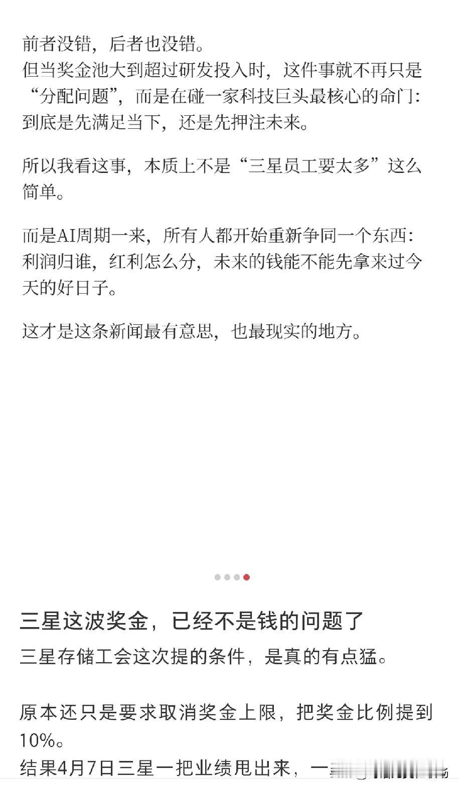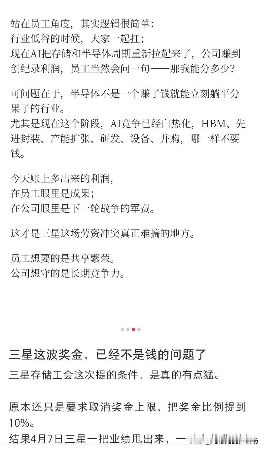 这事看着是员工暴富,其实是职场红利分配难题。行业低谷时,三星员工跟着扛亏损;现在AI带火存储芯片,公司赚得盆满钵满,员工自然要吃肉。但是半导体行业是典型的“烧钱换未来”,40.5万亿韩元奖金够砸进研发、扩产好几轮,现在把未来的战略军费全发成现金,短期爽了,长期竞争力可能被掏空。