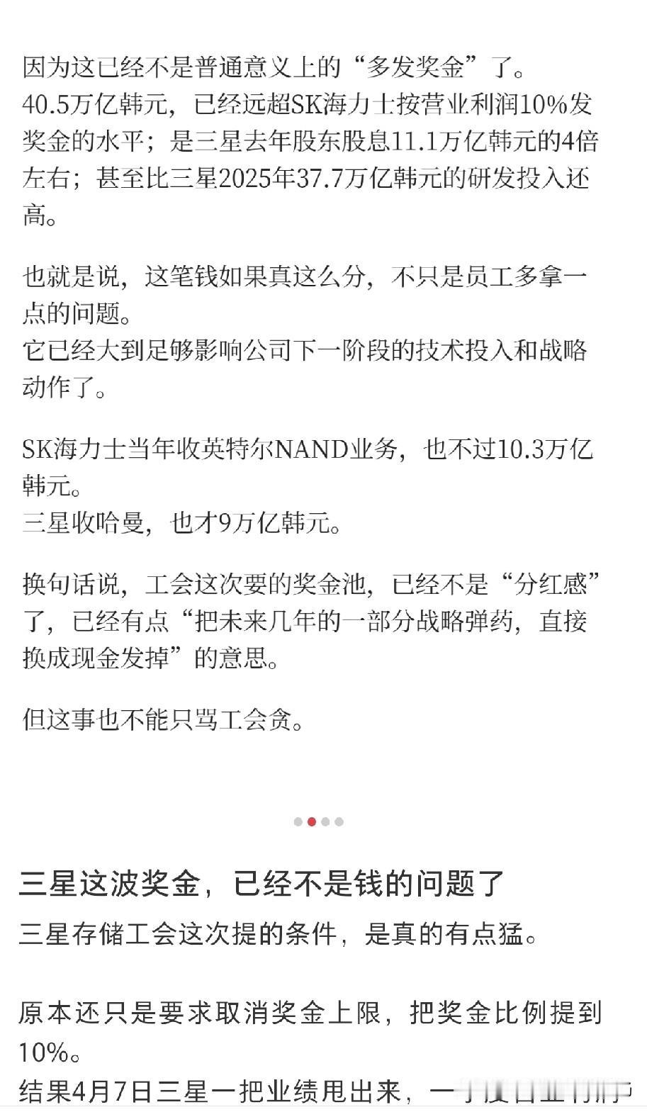 最近三星存储工会要发人均285万奖金的消息,彻底炸了职场圈。按数据算,他们要把全年营业利润的15%拿出来做奖金池,总额40.5万亿韩元,这钱比三星去年的研发投入还高,是股东股息的4倍,离谱程度堪比隔壁SK海力士收购英特尔NAND业务成本的4倍。