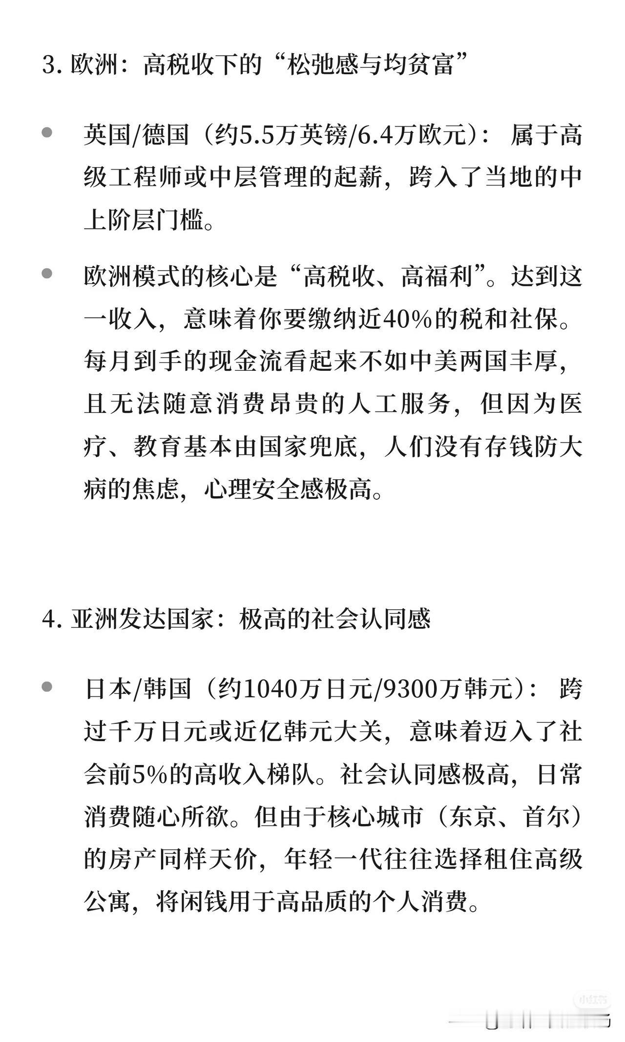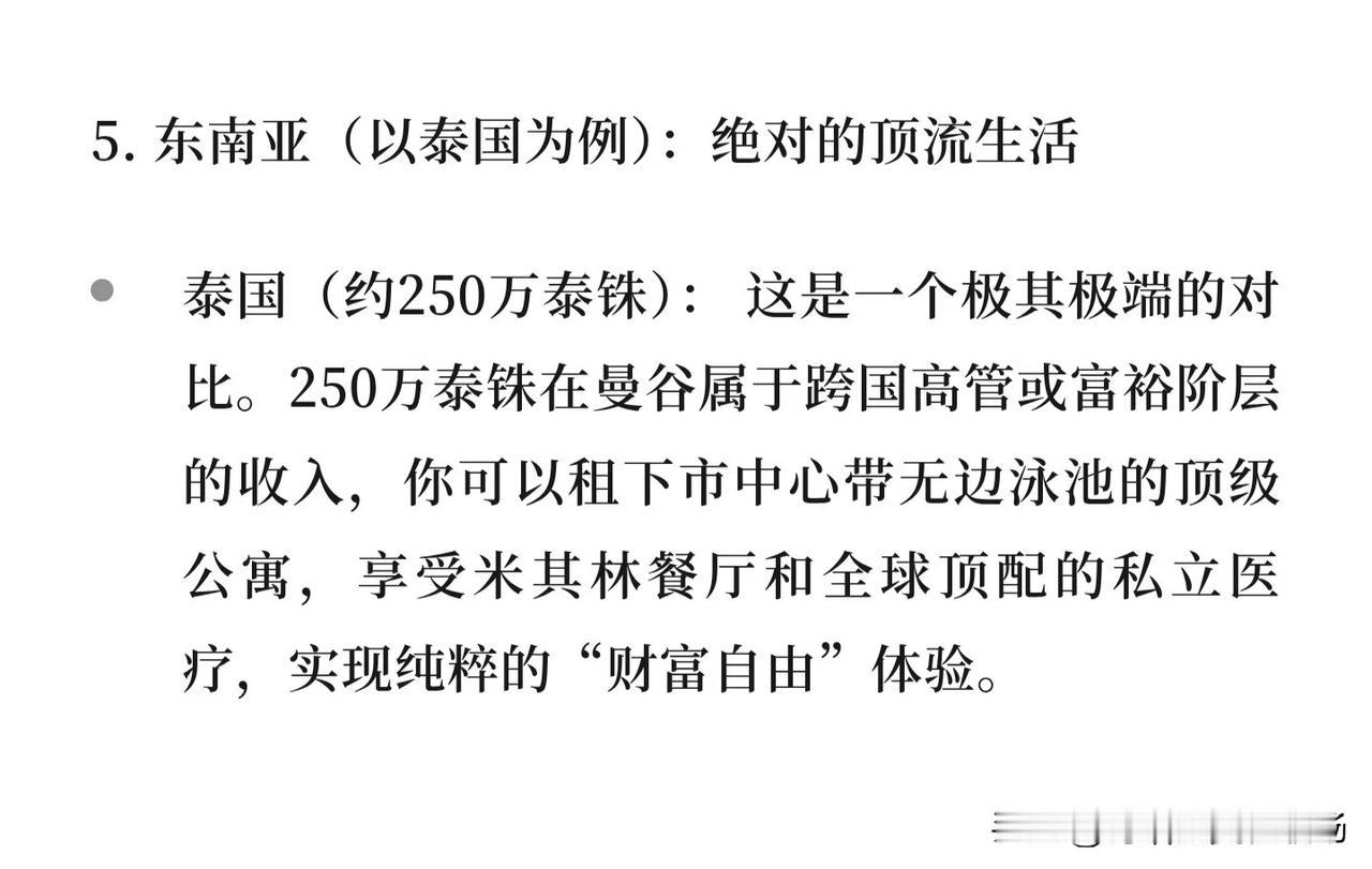 放到全球看,7万美元在美国是中等偏上收入,德州、中西部能住大house开两辆车,纽约、旧金山就只能精打细算,房租、州税、医保直接吞掉大半;在英德,相当于高级工程师起薪,看似到手少了近40%的税,但医疗教育全兜底,没了存钱防大病的焦虑;在日韩,跨过千万日元大关就是前5%的高收入,社会认同感拉满,只是东京首尔的房价同样劝退年轻人;到了泰国,250万泰铢直接是跨国高管待遇,市中心泳池公寓、米其林餐厅随便造,直接实现财富自由。