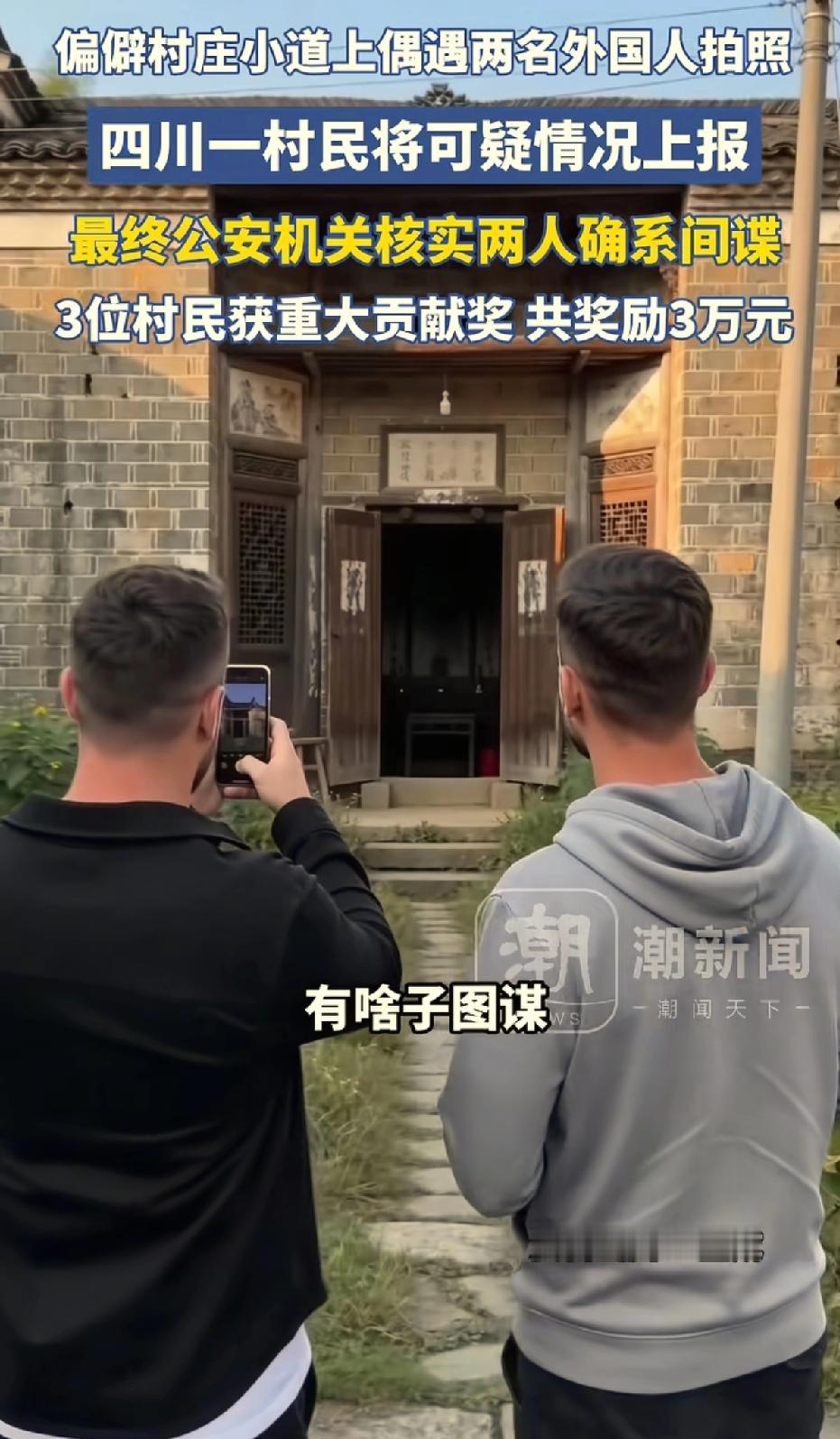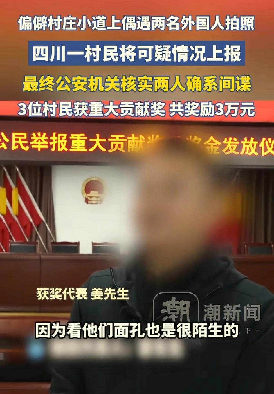 四川雅安抓到了两个间谍,是村民抓的。咱们看到可疑的,可举报,为民除害,打12339。雅安逸村庄正在搞一个重大工程,有两个外国人,一男一女拍照拍了两个多小时。村民说这两个人很面生,到小地方拍那么久的照片干嘛?举报了之后,果然查出来这两个人是间谍,三个村民奖励3万元。看来也不是多大的间谍。遇到可疑的不能掉以轻心。该警惕的时候要警惕。