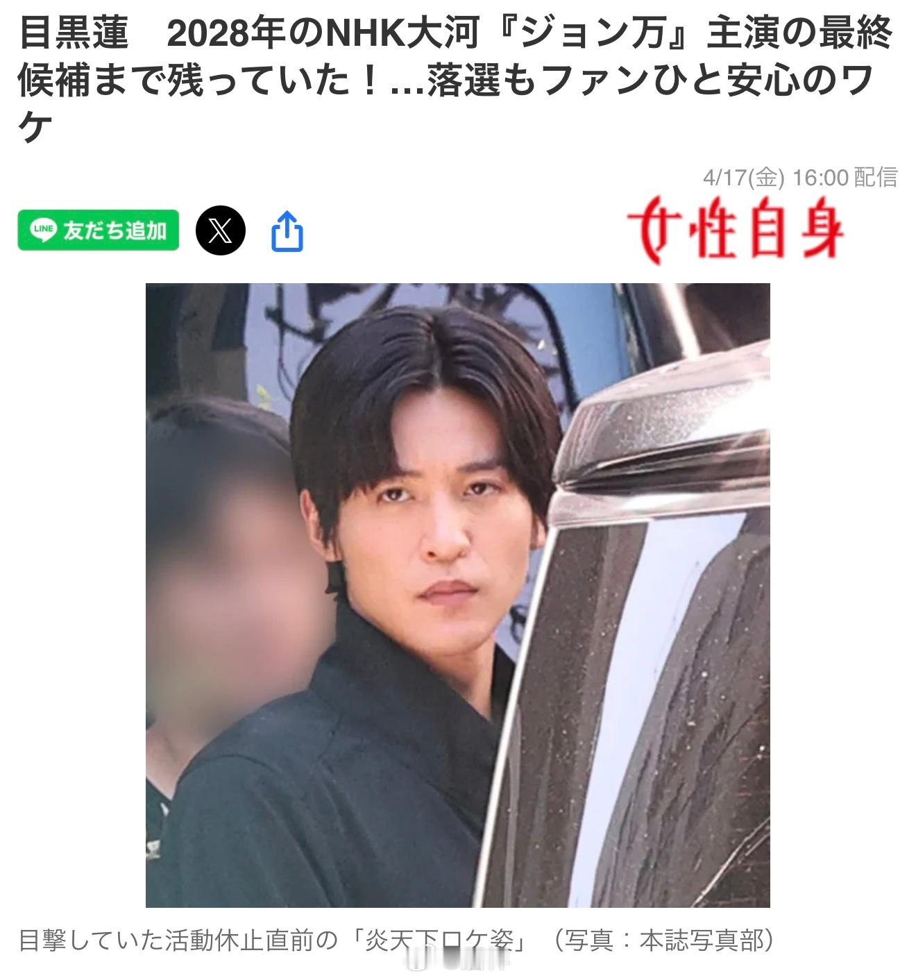 预定将于2028年播出的NHK大河剧『约翰万』因将由首次出演大河剧的山崎贤人(31)担任主演而备受瞩目。但据本刊采访获悉,Snow Man组合的成员目黑莲(29)实际上作为主演候选人之一,一直留到了最终选拔阶段。