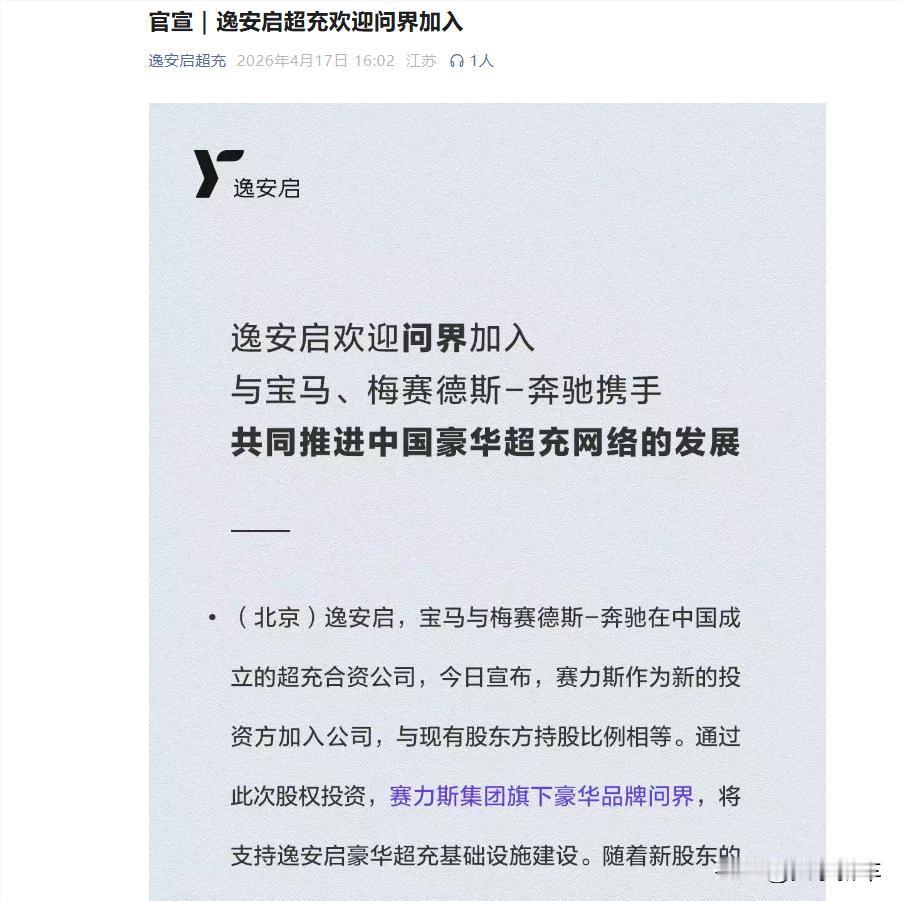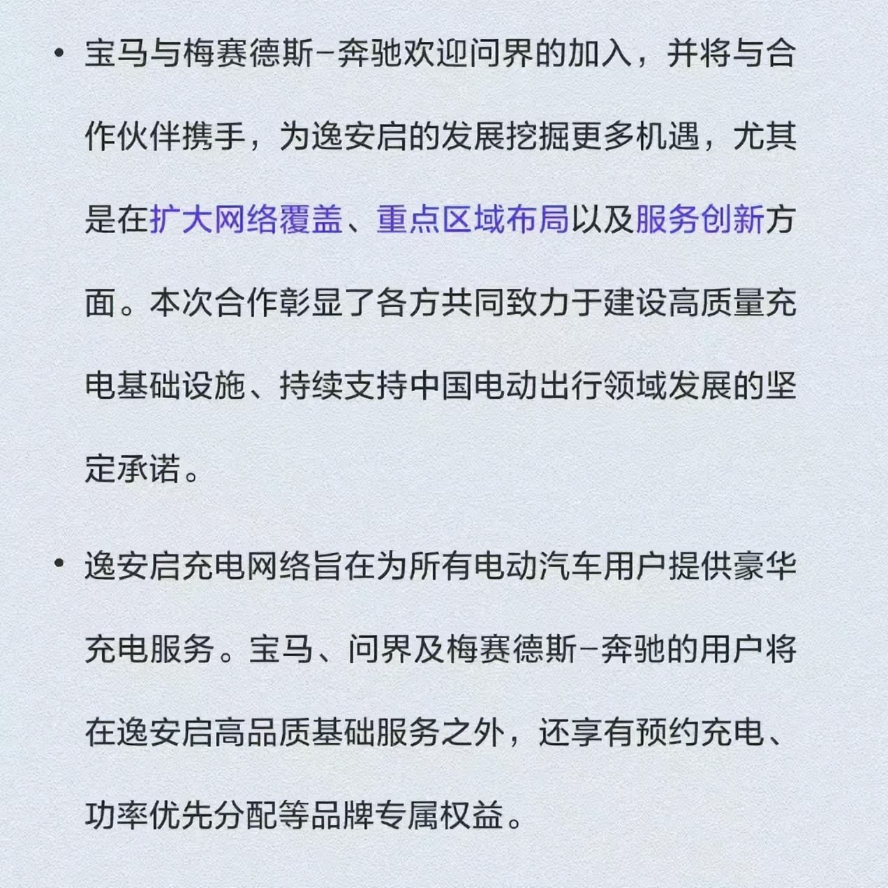 “逸安启”是梅赛德斯 - 奔驰与宝马于2023年成立的超充公司,就在刚刚,“逸安启”宣布问界加入“逸安启”超级快充,赛力斯成为“逸安启”股东,奔驰、宝马和赛力斯各持股33.3%,三家共享“逸安启”的超级快充网络。
