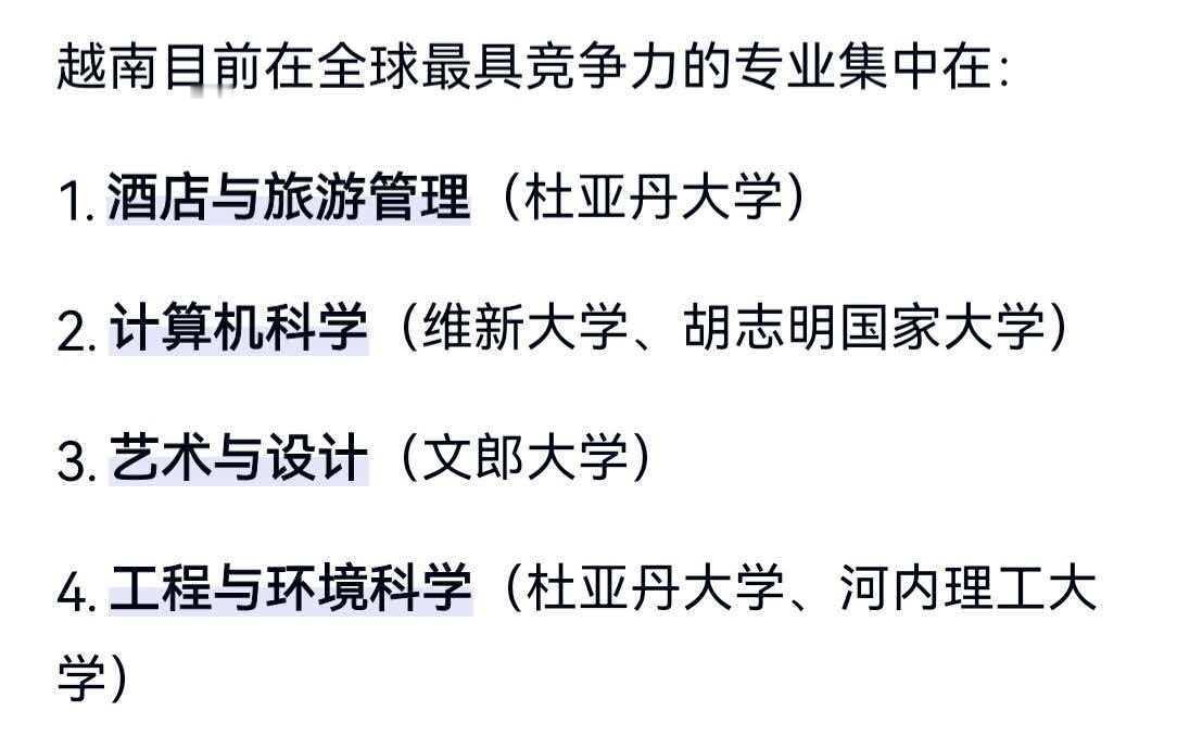 越南最好的大学,在全世界专业排名中,也要在400名以外!咱们有5所大学在前100名!越南大学的优势专业都是旅游、环境、农林学、计算机等非工科专业!