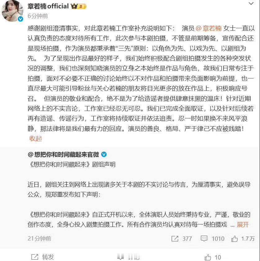 剧方回应章若楠拍戏走神章若楠工作室已取证17日,针对网传章若楠拍戏走神的争议,发布官方声明澄清:网传拍摄现场片段系断章取义,与现场实际情况严重不符,演员拍摄期间始终保持高度敬业,全程积极配合剧组各项拍摄安排。随后,转发剧方声明,感谢剧组澄清事实,同时表示演员始终以“角色为先、以戏为先、以剧组为先”的原则对待工作,敬业与配合不应成为造谣者肆意抹黑的温床。目前工作室已针对不实言论完成全面取证,后续将对造谣传谣行为持续取证并依法追责。