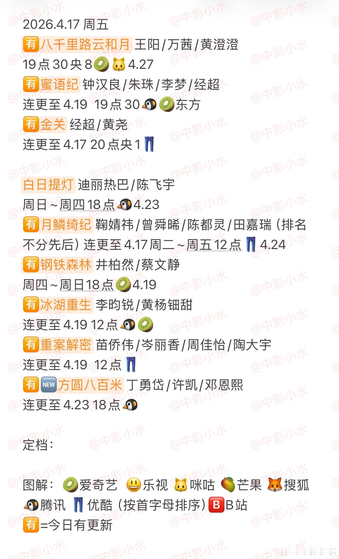 拯救剧荒 4月17日,今晚看点啥??图1 追剧日历 图2 综艺日历 图3 已完结剧集 🈶八千里路云和月 王阳/万茜/黄澄澄🈶蜜语纪 钟汉良/朱珠/李梦/经超🈶金关 经超/黄尧