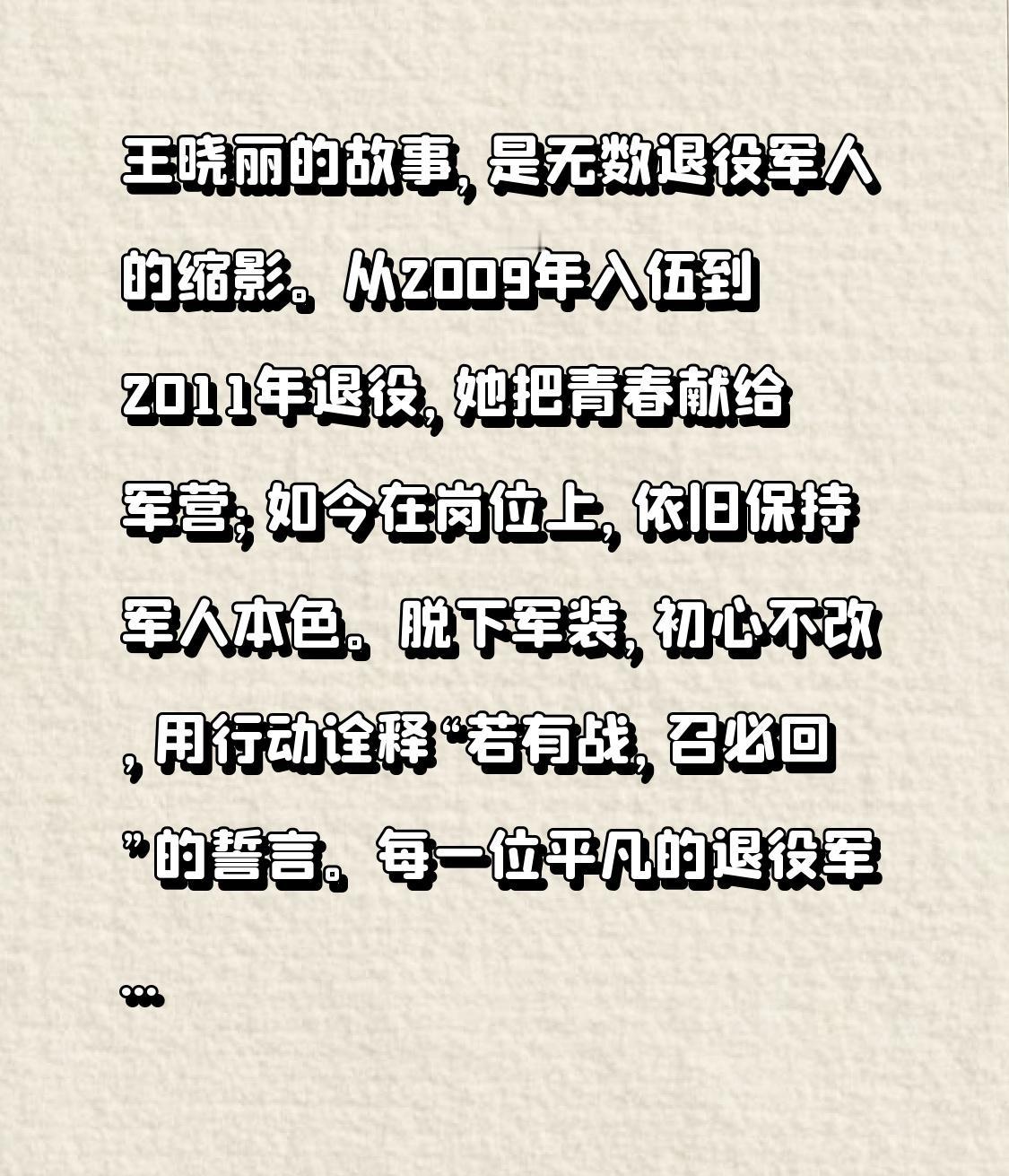 王晓丽的故事,是无数退役军人的缩影。从2009年入伍到2011年退役,她把青春献给军营;如今在岗位上,依旧保持军人本色。脱下军装,初心不改,用行动诠释“若有战,召必回”的誓言。每一位平凡的退役军人,都在用坚守书写担当。