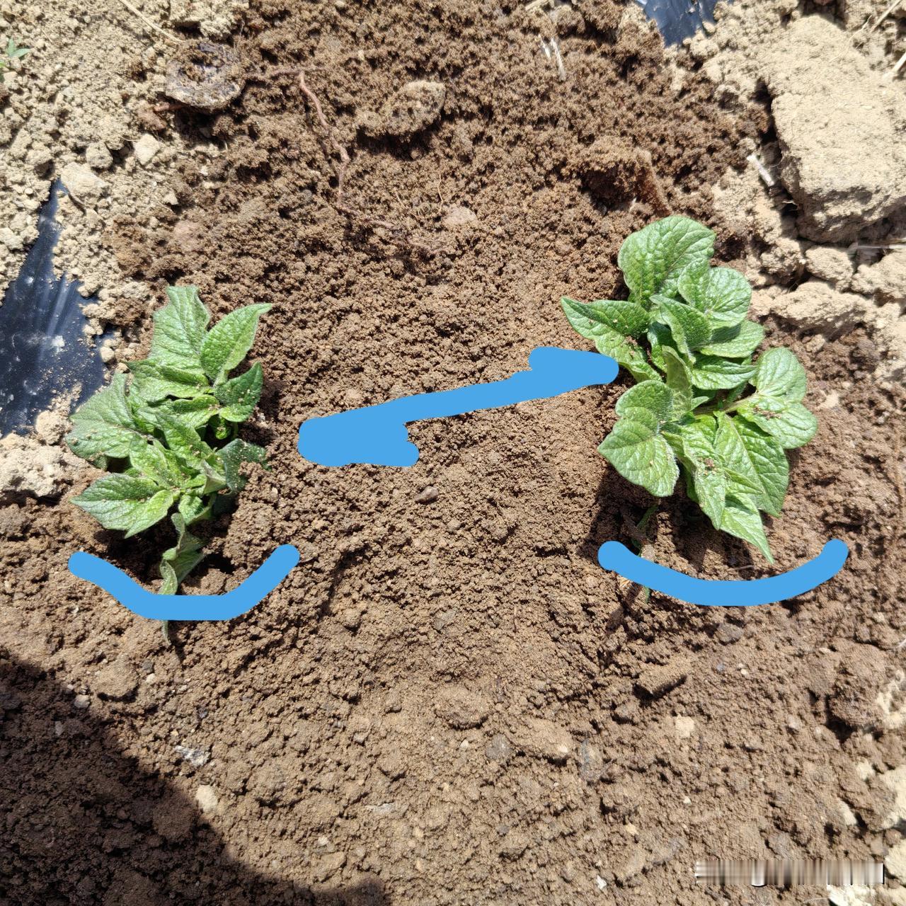 第3第4图片,是同一穴土豆,一周前后定苗对比。