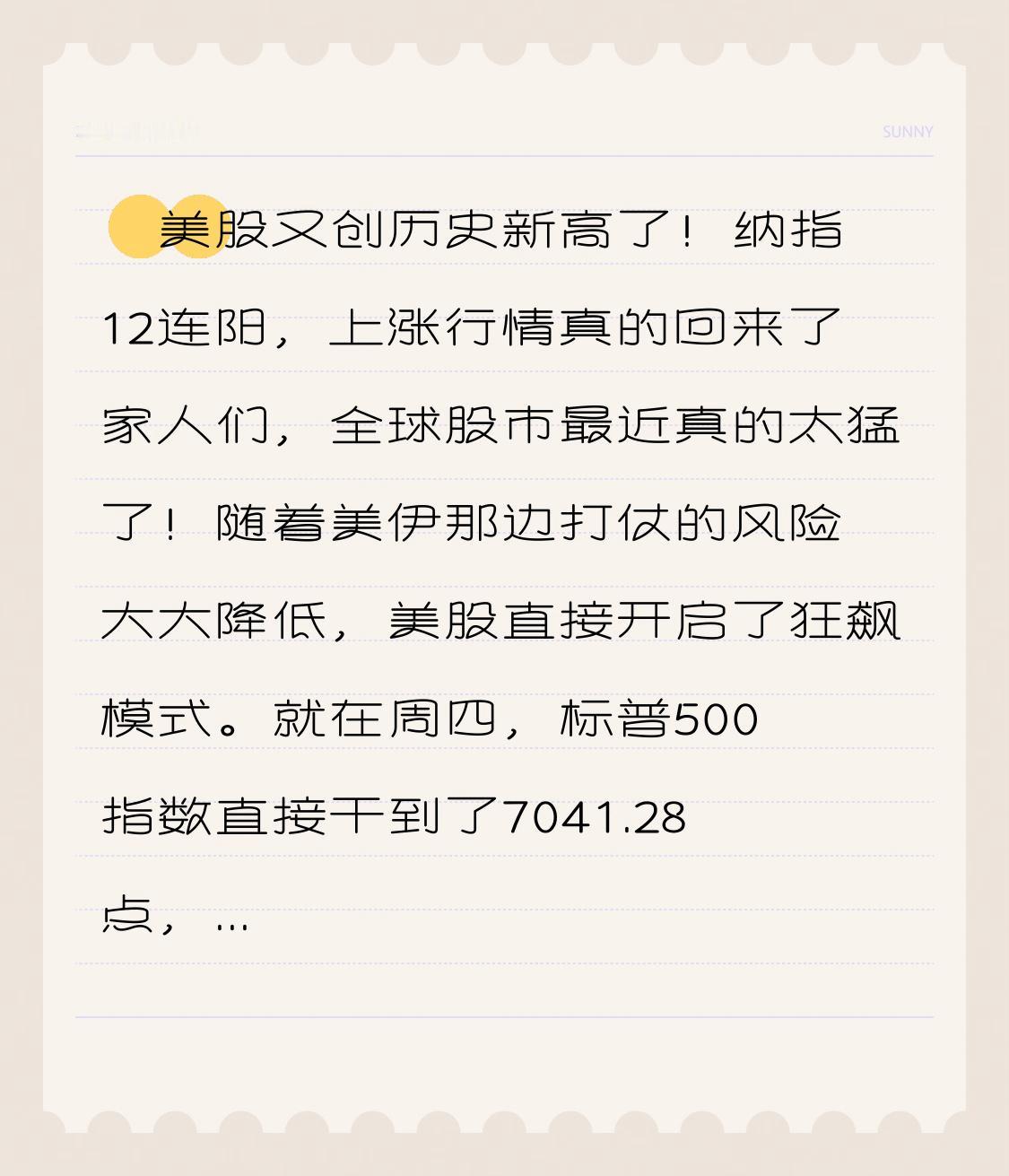 就在周四,标普500指数直接干到了7041.28点,刷新了历史新高,超过了今年1月的峰值。纳斯达克更猛,已经走出了12连阳,那种熟悉的一路上涨的感觉又回来了。