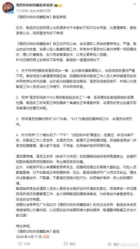 【剧方否认网传章若楠拍戏走神】16日,网传章若楠片场拍戏走神引热议,刚刚发声明回应称关于网传拍摄现场演员回头一事,此内容纯属断章取义,与现场实际情况严重不符。演员在拍摄期间始终保持高度敬业,全程积极配合剧组各项拍摄安排。也转发剧组声明称感谢剧组澄清事实,并称针对恶意造谣已完成全面取证。