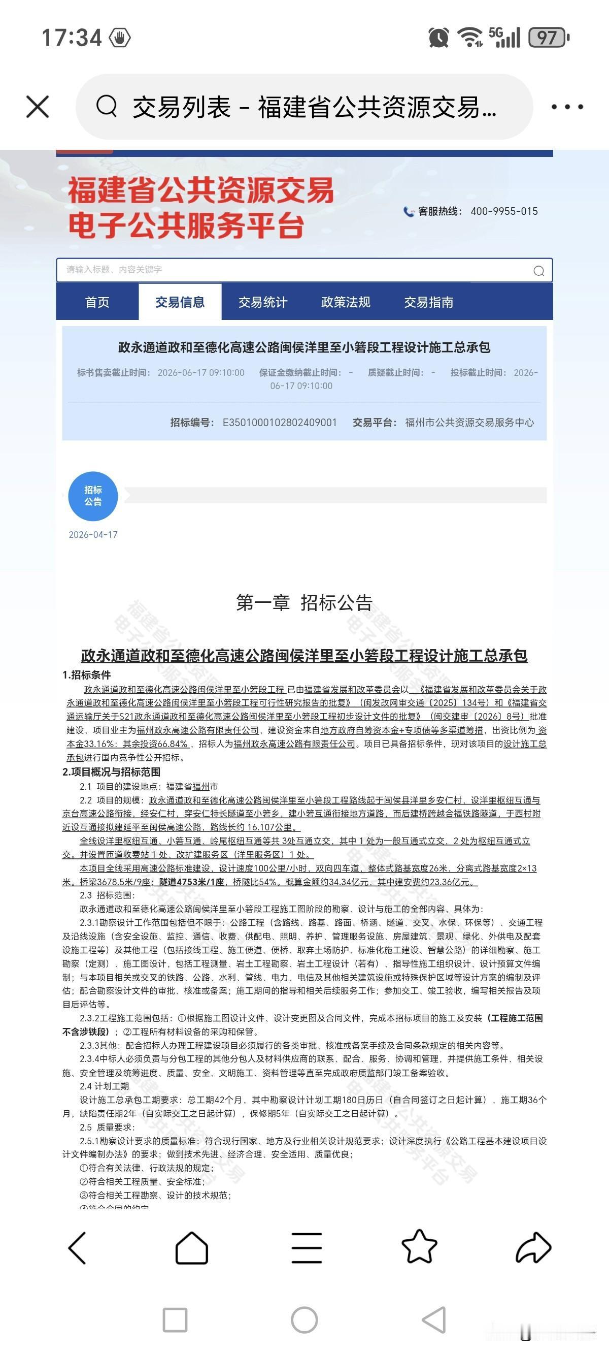 福州市总投资高达34亿元的政永高速洋里至小箬段传来全新进展,设计施工总承包招标正式发布。