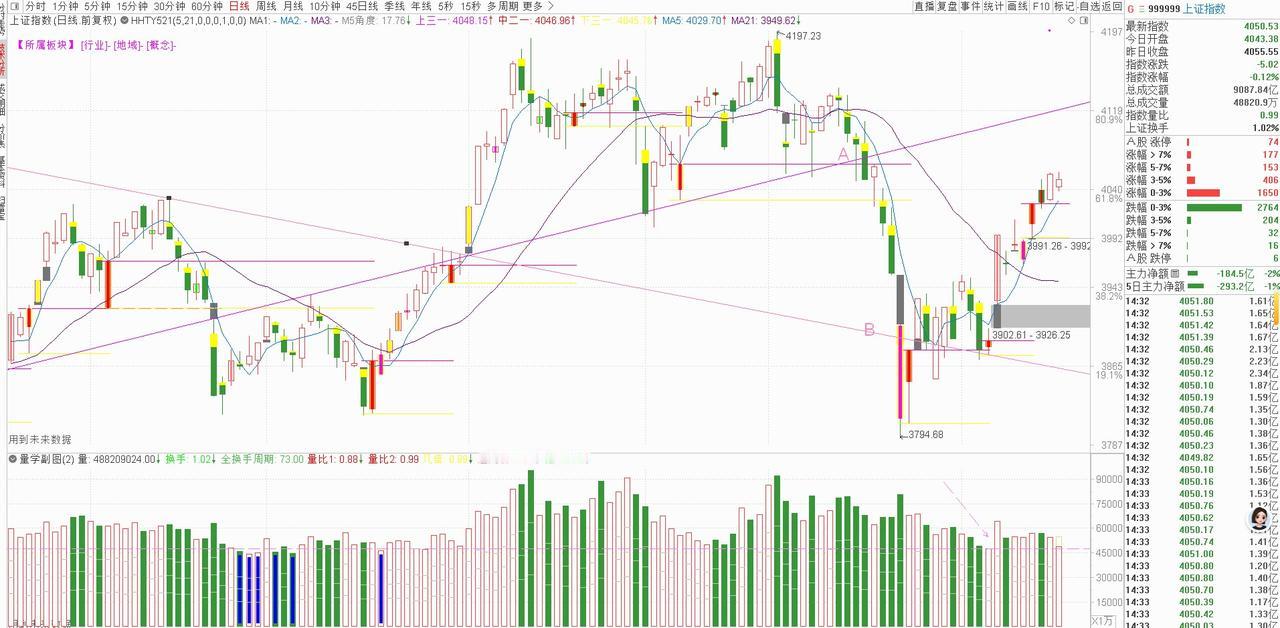 目前大盘已运行至前期平台底部,上方压力凸显,下一关键压力位锁定4110点附近。当前大盘已顺利完成刹车、换挡阶段,后续需等待加油段极阴次阳形成王牌柱,才能有效突破该压力位,打开上行空间。基于此,我划定下周一盘前三线:上线4070点、中线4050点、下线4030点,为走势判断提供参考。