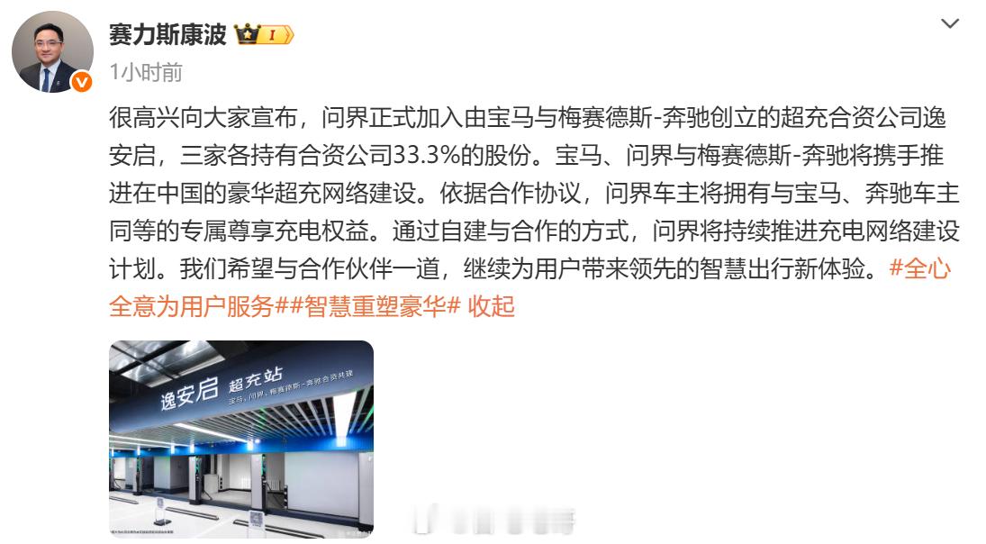 问界正式加入由宝马与梅赛德斯-奔驰创立的超充合资公司逸安启,三家各持有合资公司33.3%的股份。宝马、问界与梅赛德斯-奔驰将携手推进在中国的豪华超充网络建设