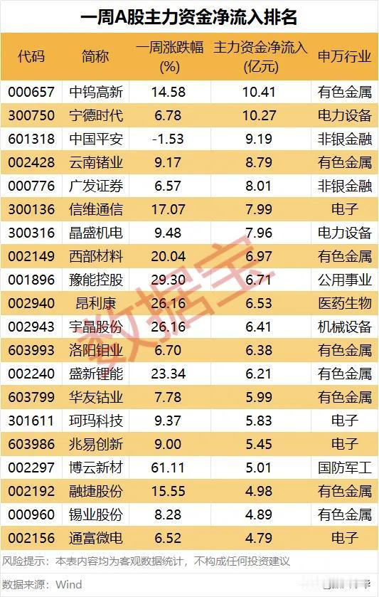 一周A股主力资金净流入、流出排名!