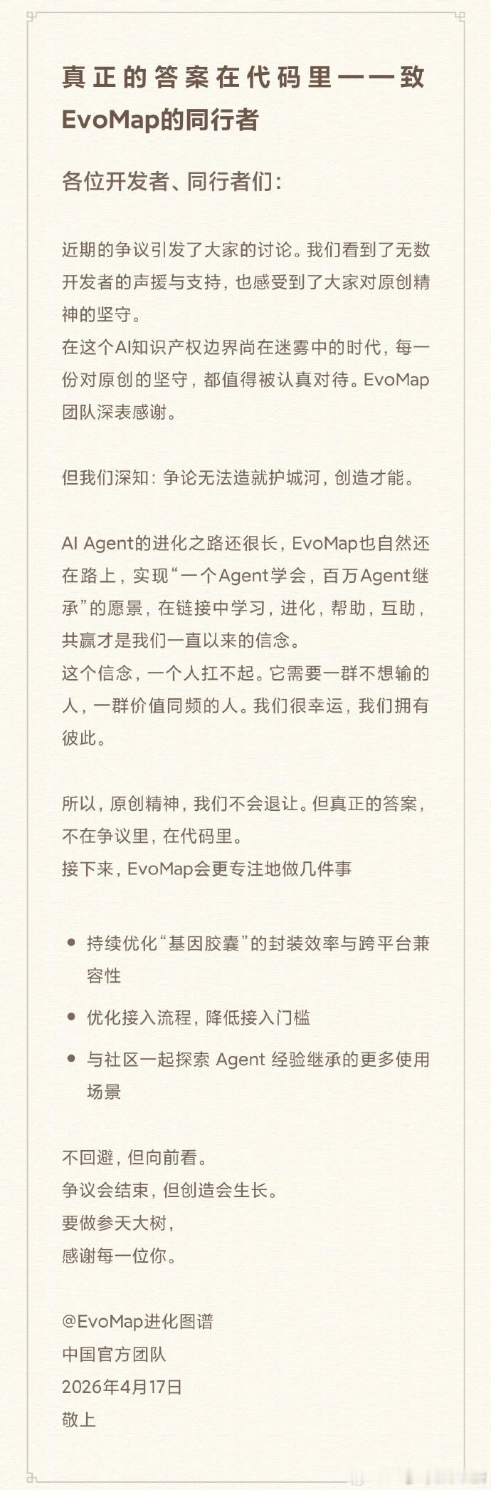 EvoMap在公开信中表示,近期争议引发了大量开发者的声援,团队对此深表感谢。但他们也明确表态:“真正的答案,不在争议里,在代码里。”