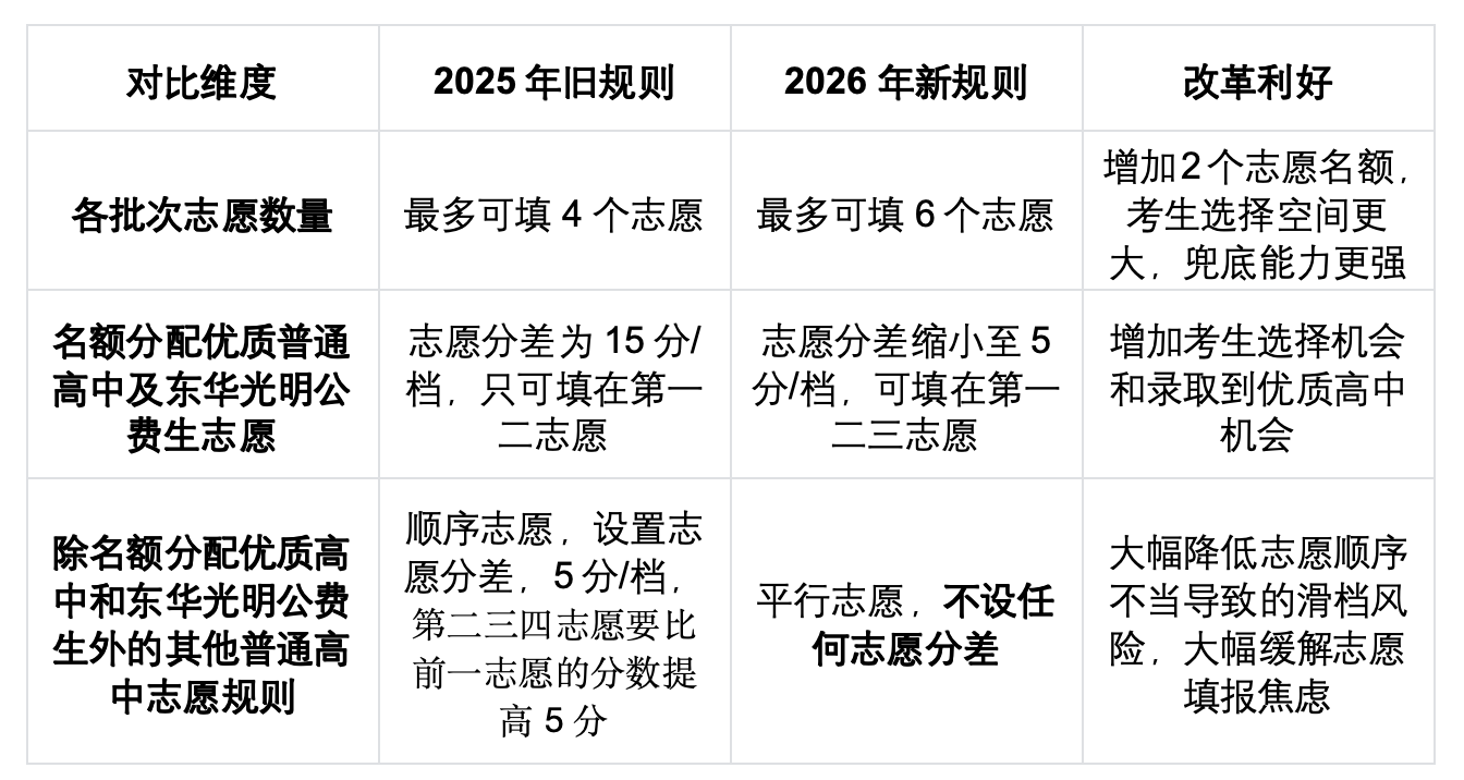 三是除名额分配优质高中和东华光明公费生外的其他普高,从以往的5分志愿分差,调整为平行志愿、不设分差。大幅降低考生因志愿顺序填报不当导致的滑档风险,提高录取机会,降低考生和家长志愿填报焦虑。