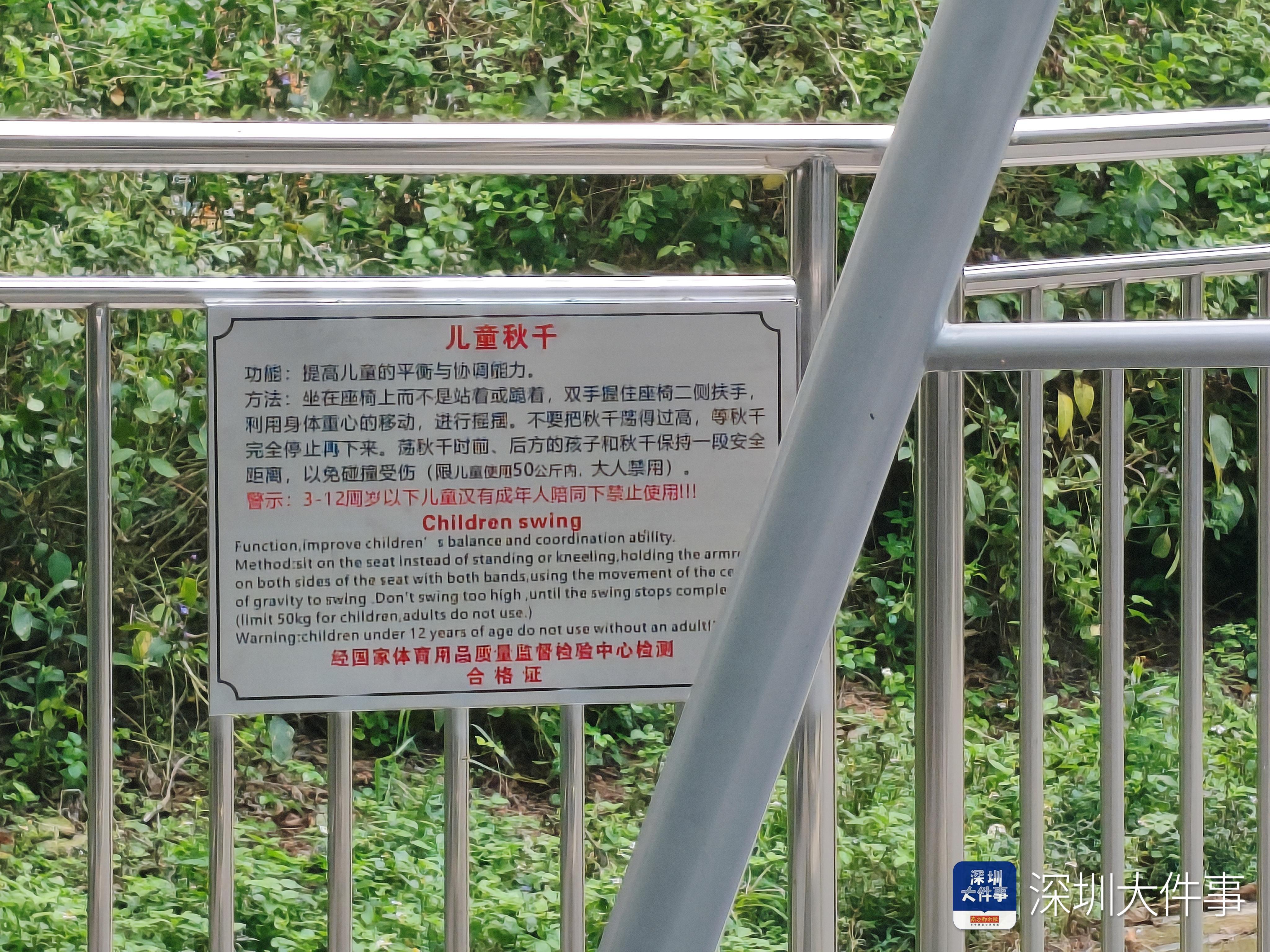 林先生提到的秋千区域,仍保留着设施的支架,旁边的说明牌标注着“儿童秋千”的使用规则与安全警示,只是未见秋千座椅。此外,场地与楼栋之间设有不锈钢围栏阻隔,而几处出入口位置的钢门均已上锁,实现了全围挡封闭。