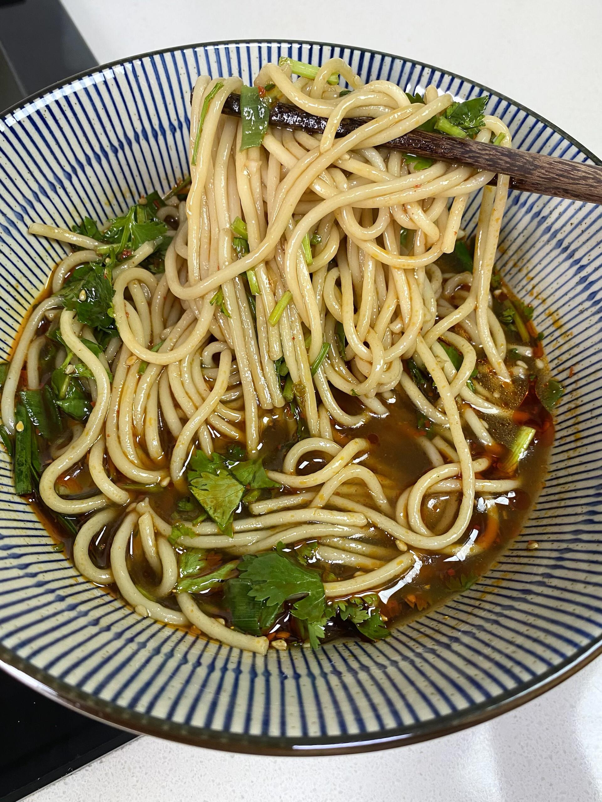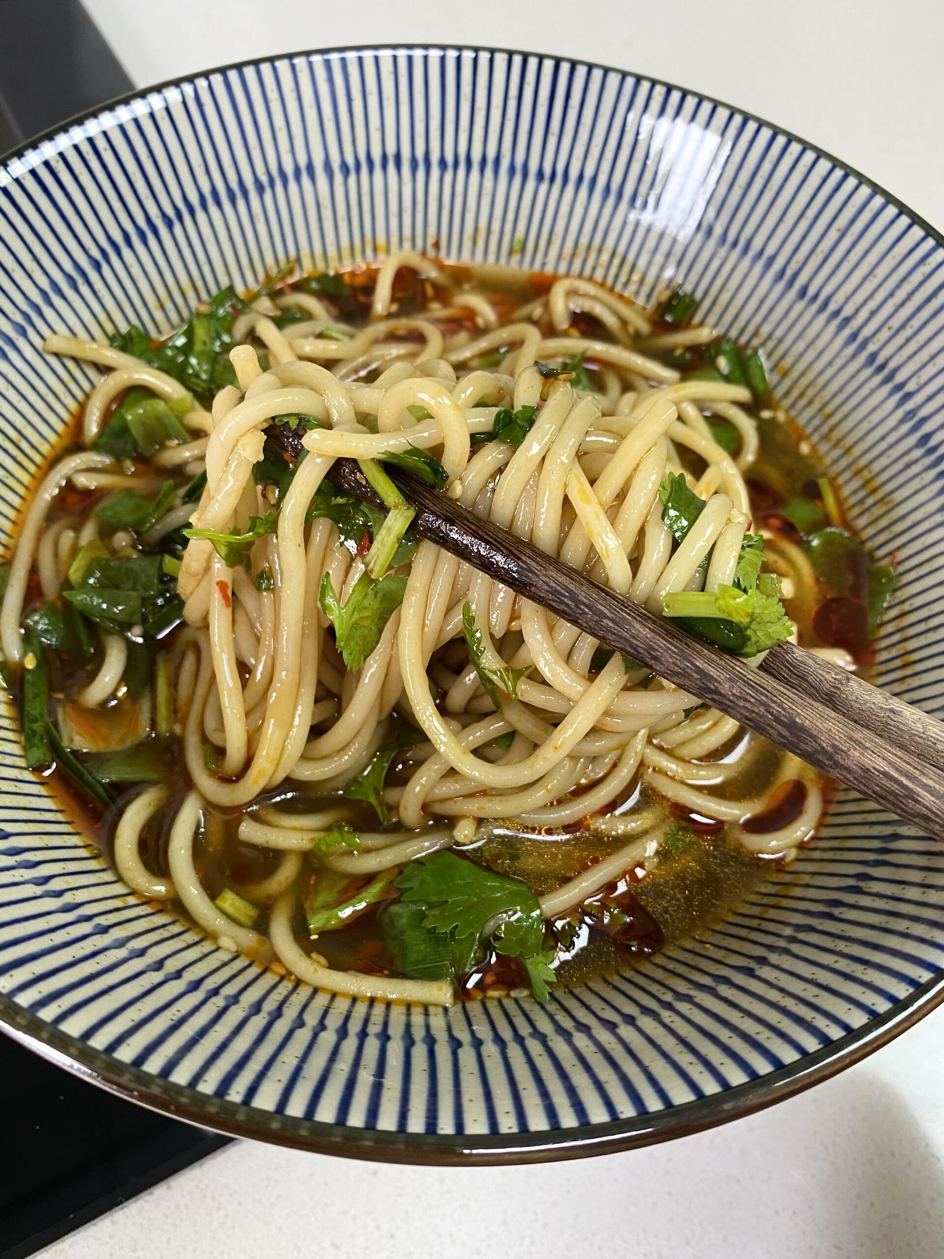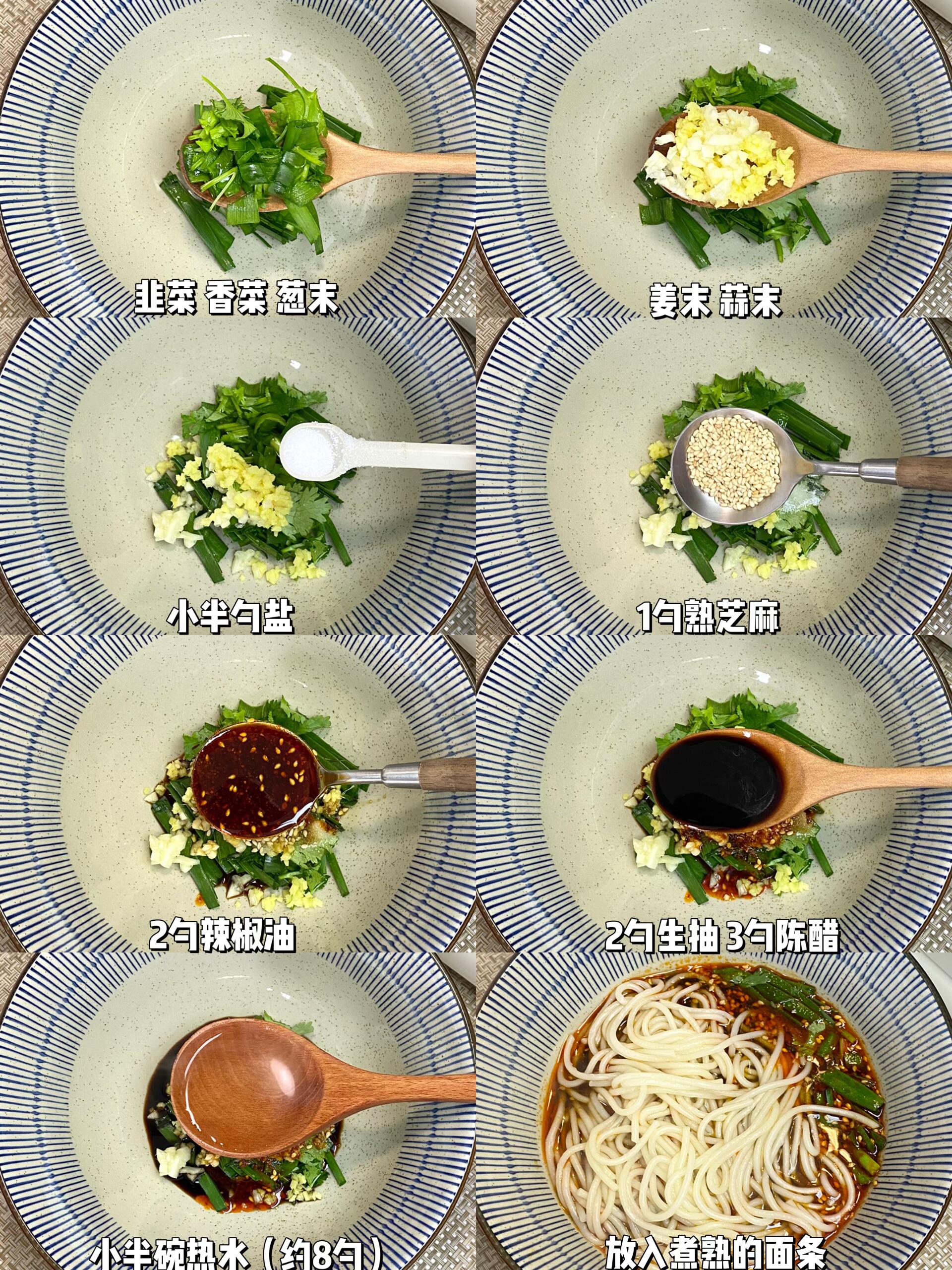 韭菜、香菜、葱、姜蒜末🧄、小半勺盐🧂、1勺熟芝麻、🌶️2勺辣椒油、2勺生抽、🍶3勺陈醋、小半碗热水、面条