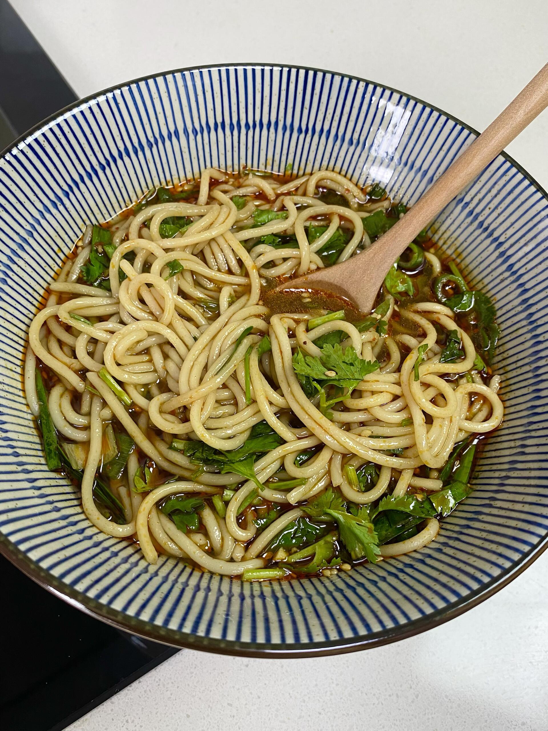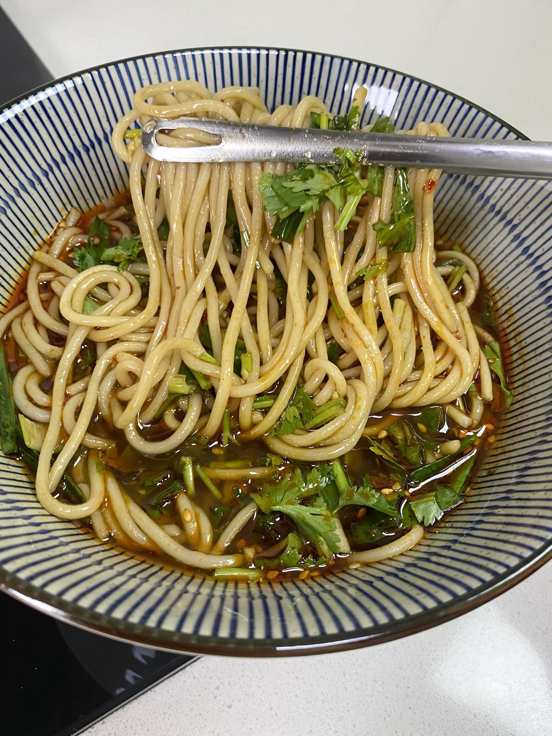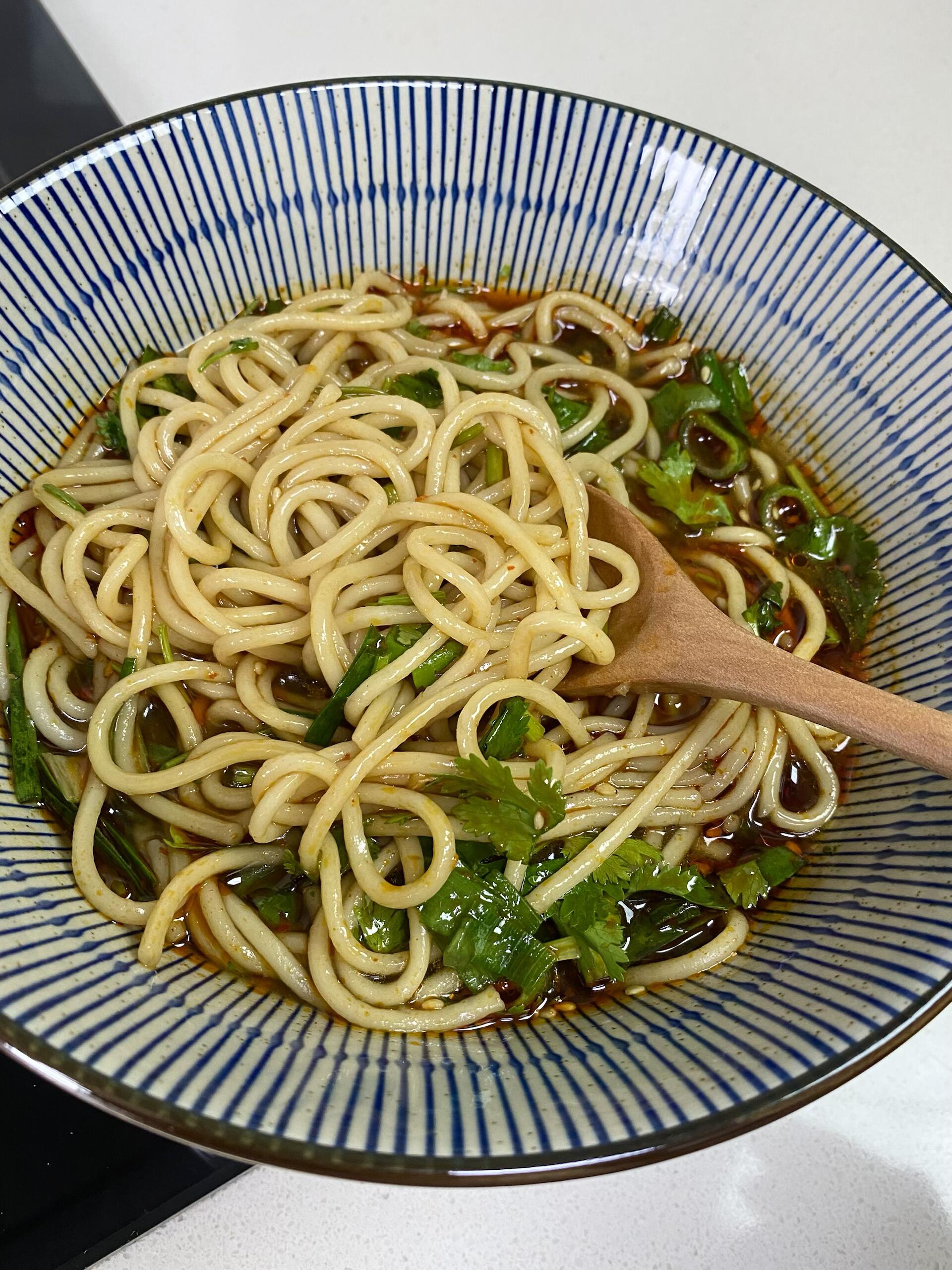 韭菜、香菜、葱、姜蒜末🧄、小半勺盐🧂、1勺熟芝麻、🌶️2勺辣椒油、2勺生抽、🍶3勺陈醋、小半碗热水、面条