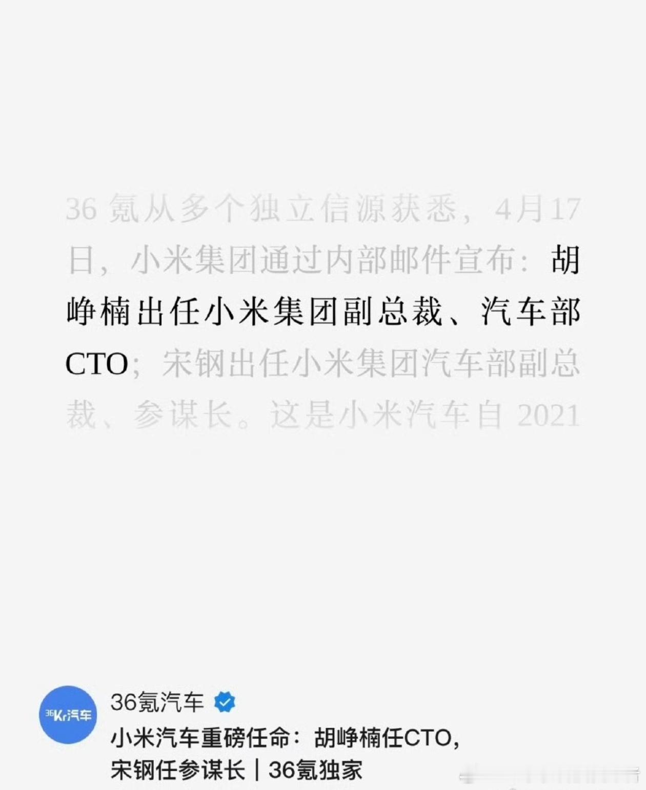 胡峥楠出任小米集团副总裁胡峥楠将出任小米集团副总裁,担任小米汽车部CTO,很受集团和雷军的重视啊。我觉得这也是应该的,毕竟他带领的团队对小米汽车真的很重要,相比较之前的公司,小米最大的好处就是可以保持创业的姿态,能放开手脚的干,也算是找对人了。