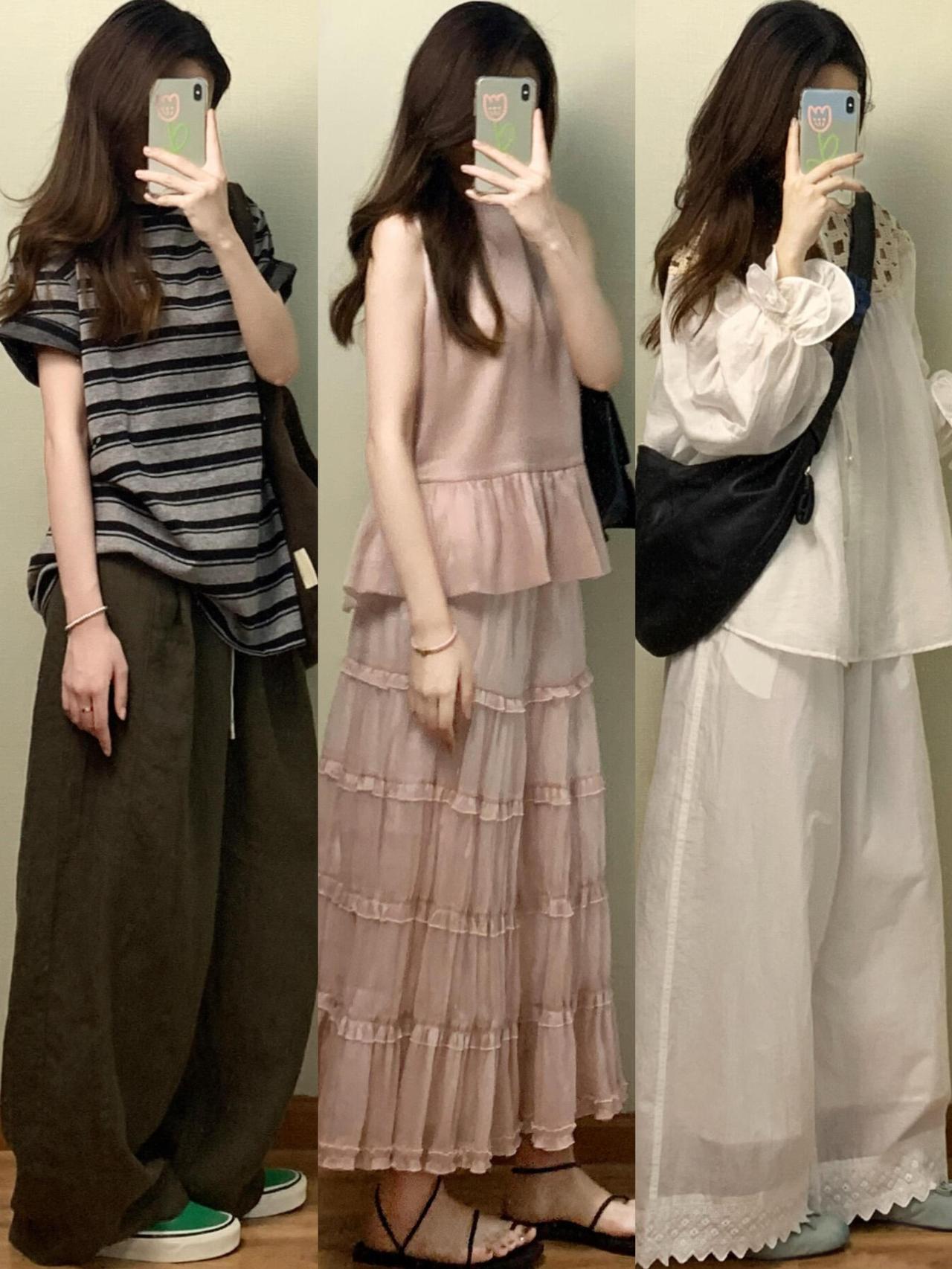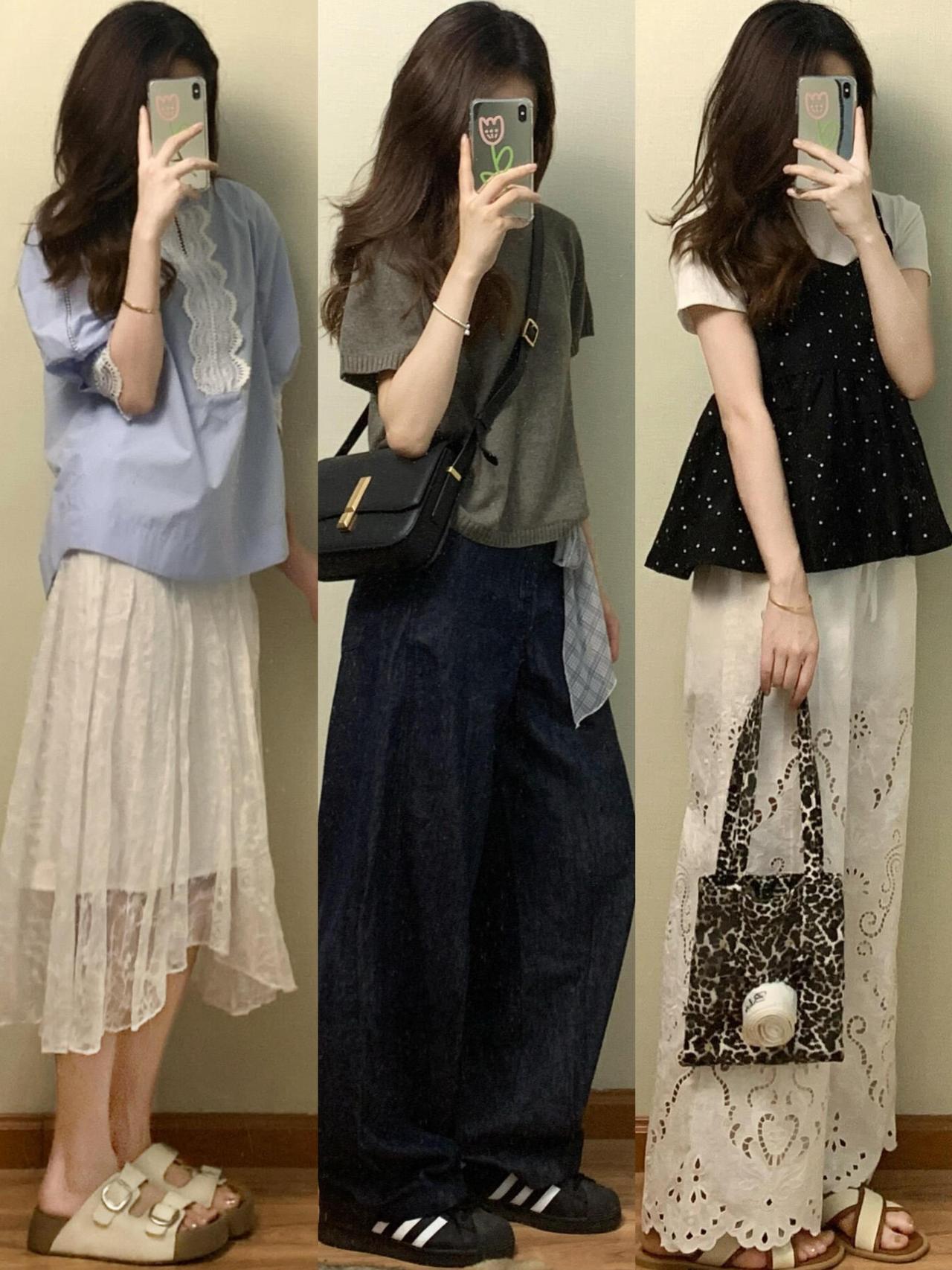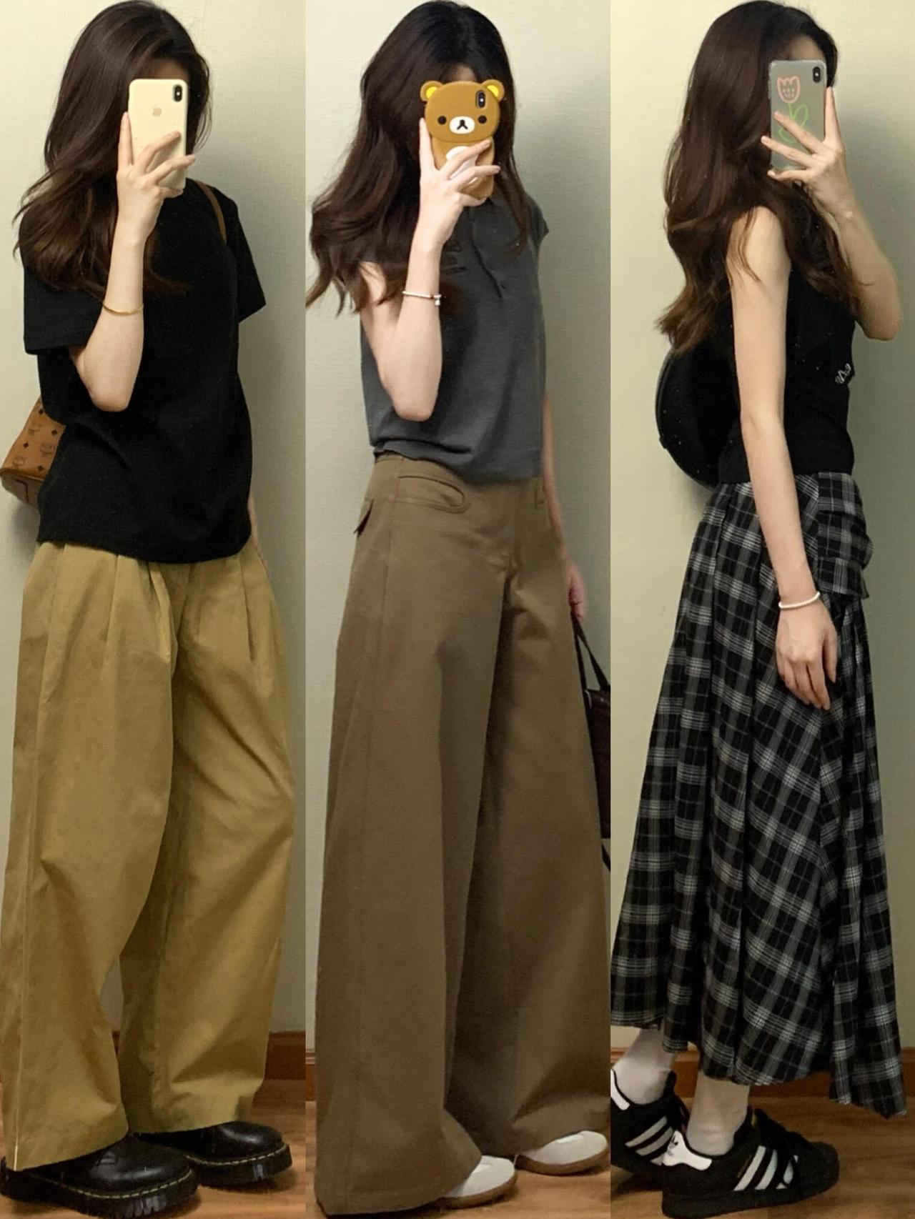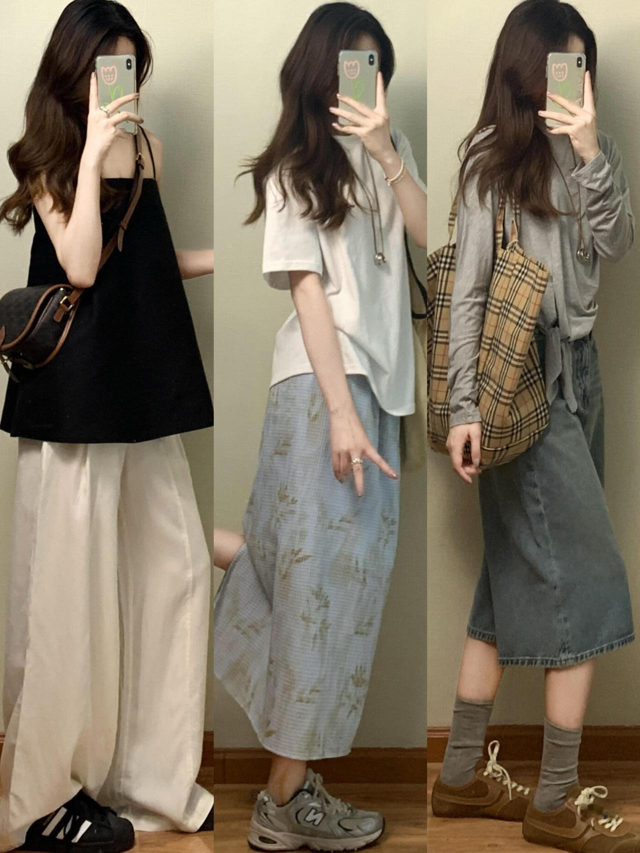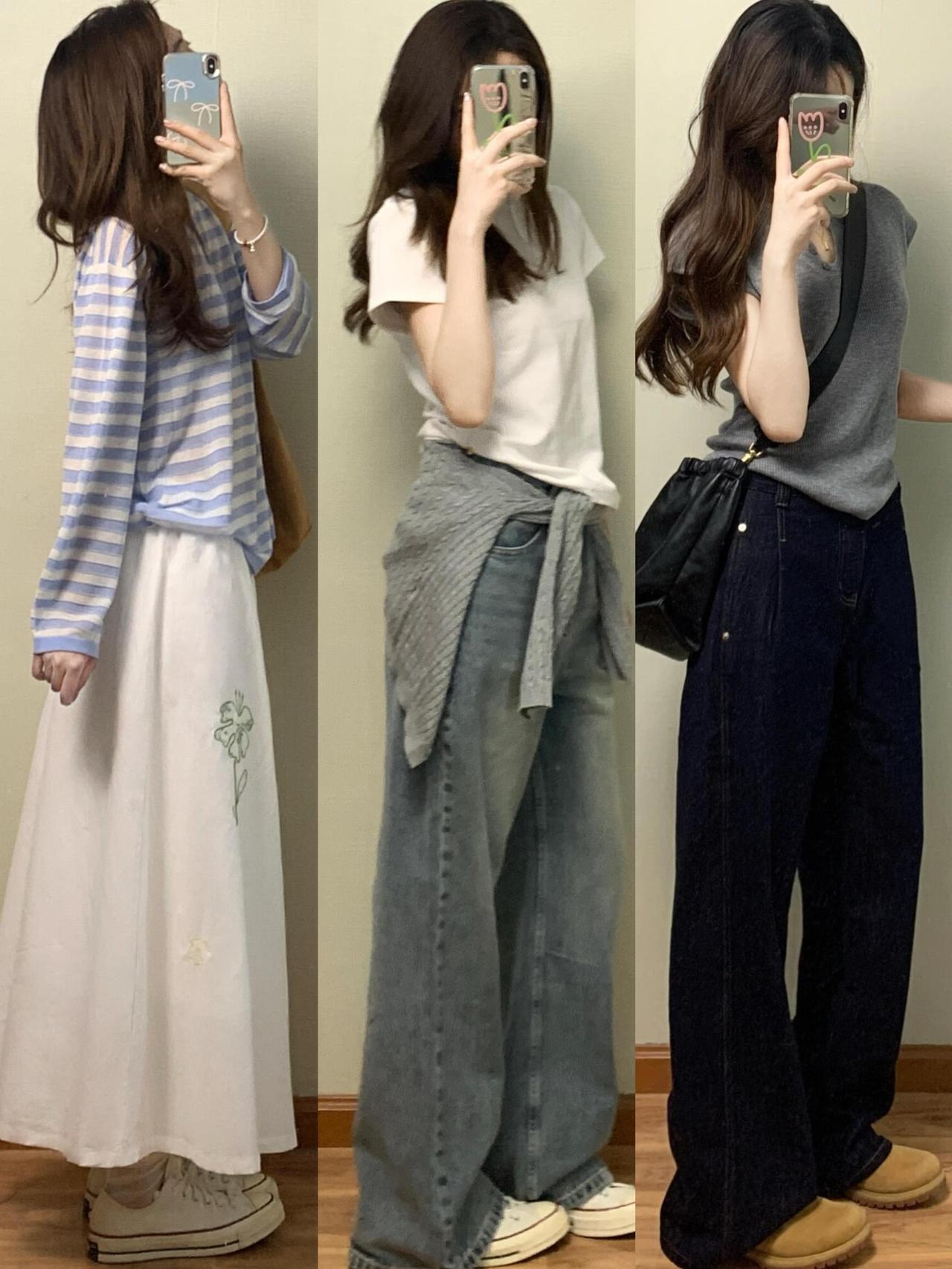 基础款T恤、针织衫搭配牛仔半裙、阔腿裤或碎花
