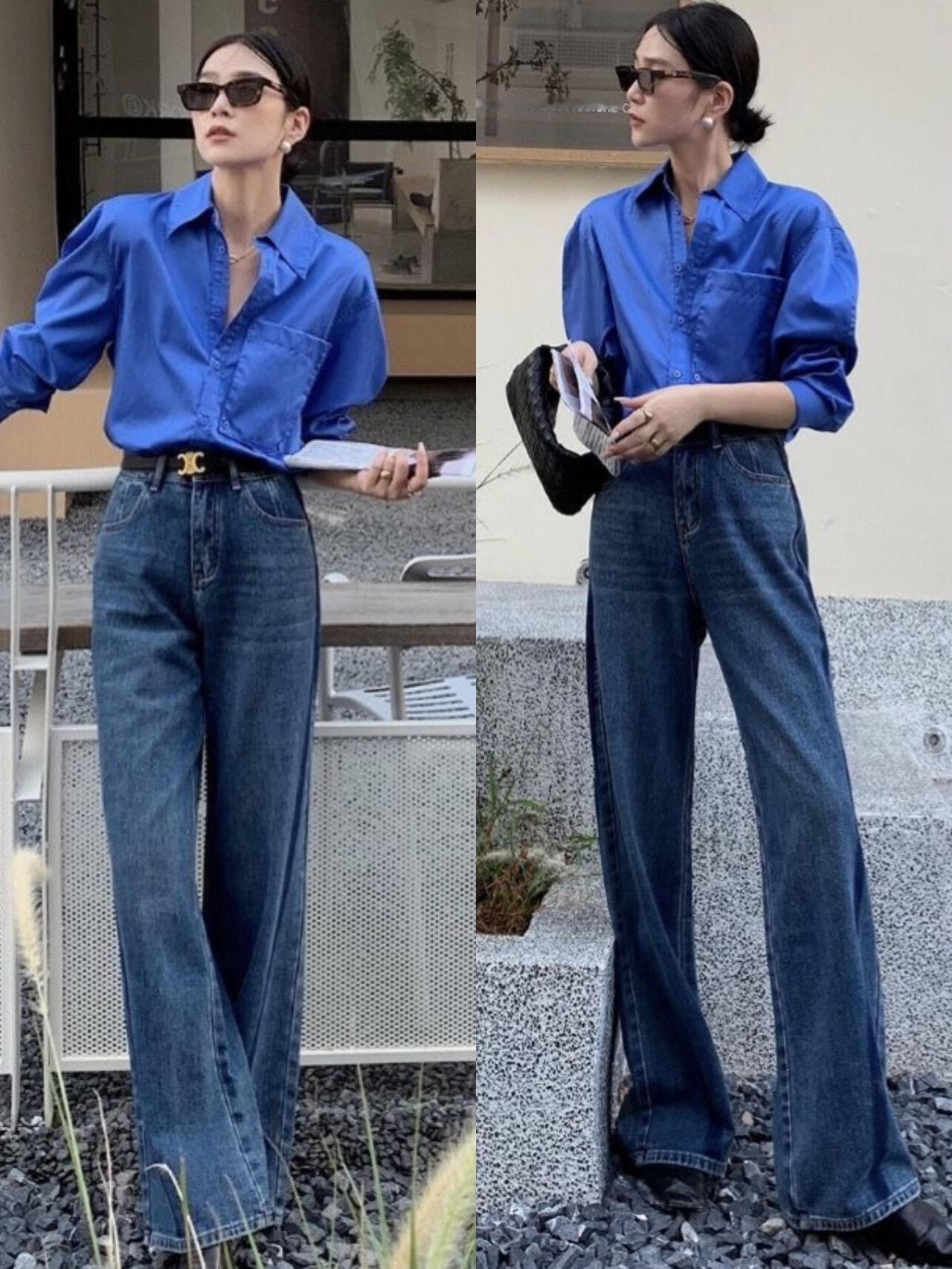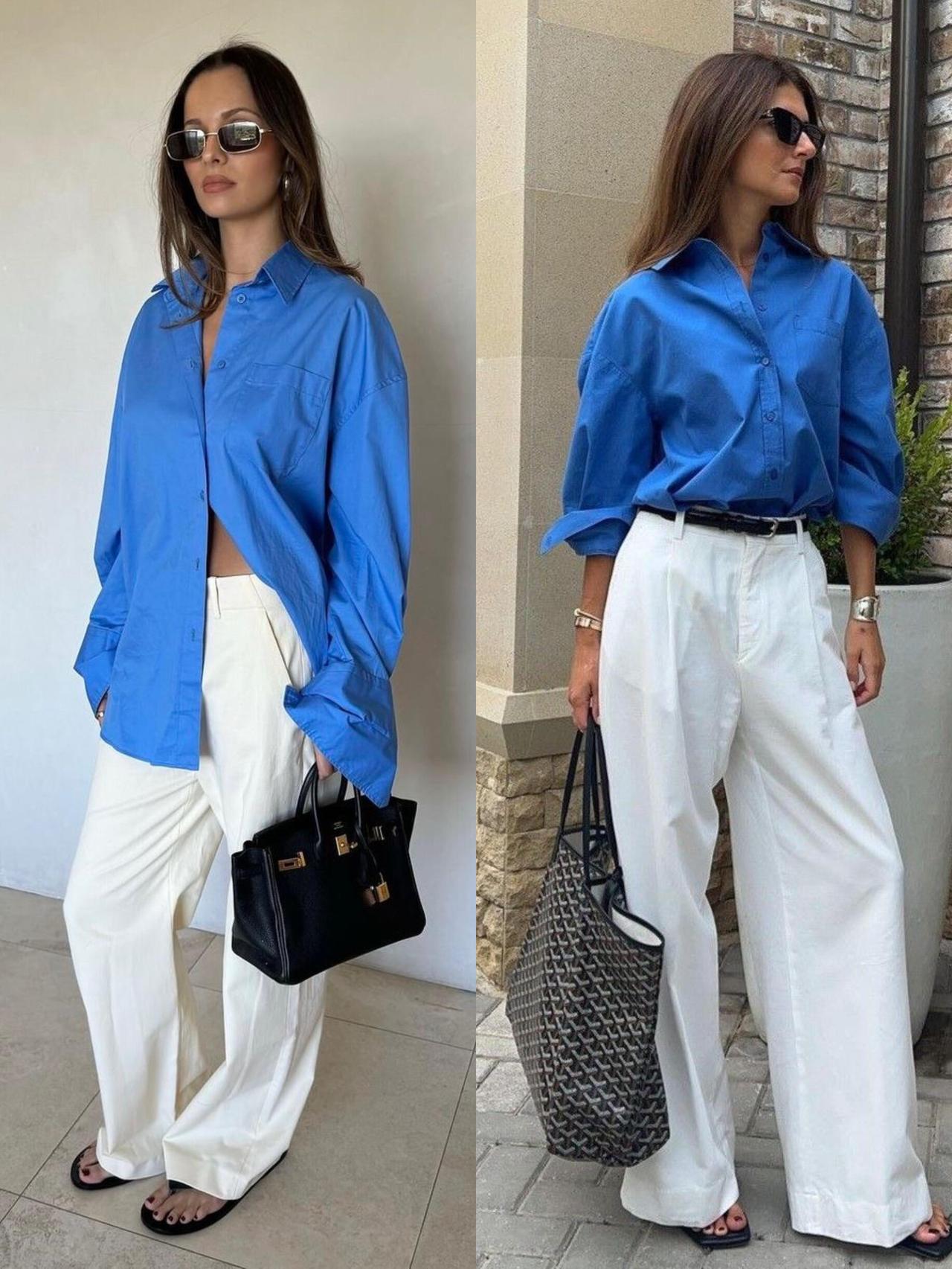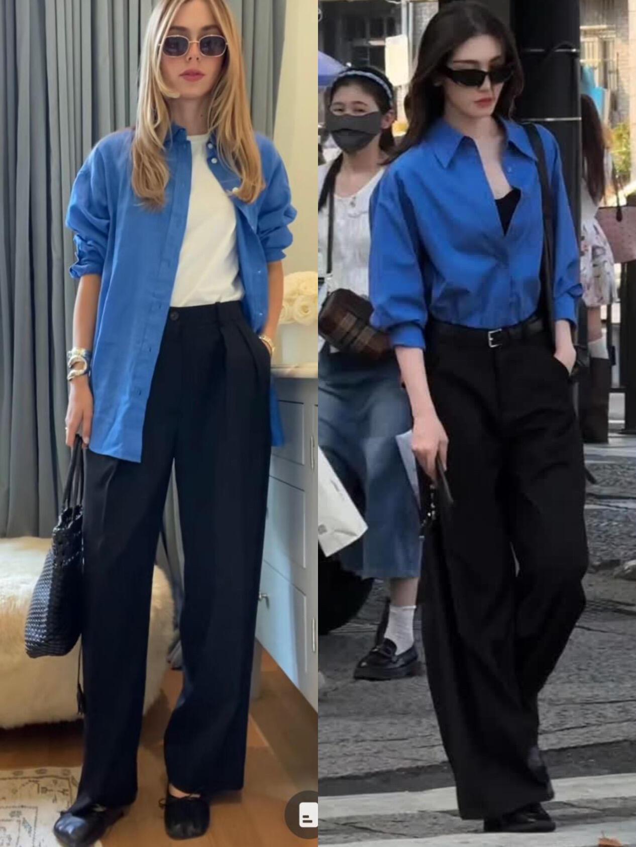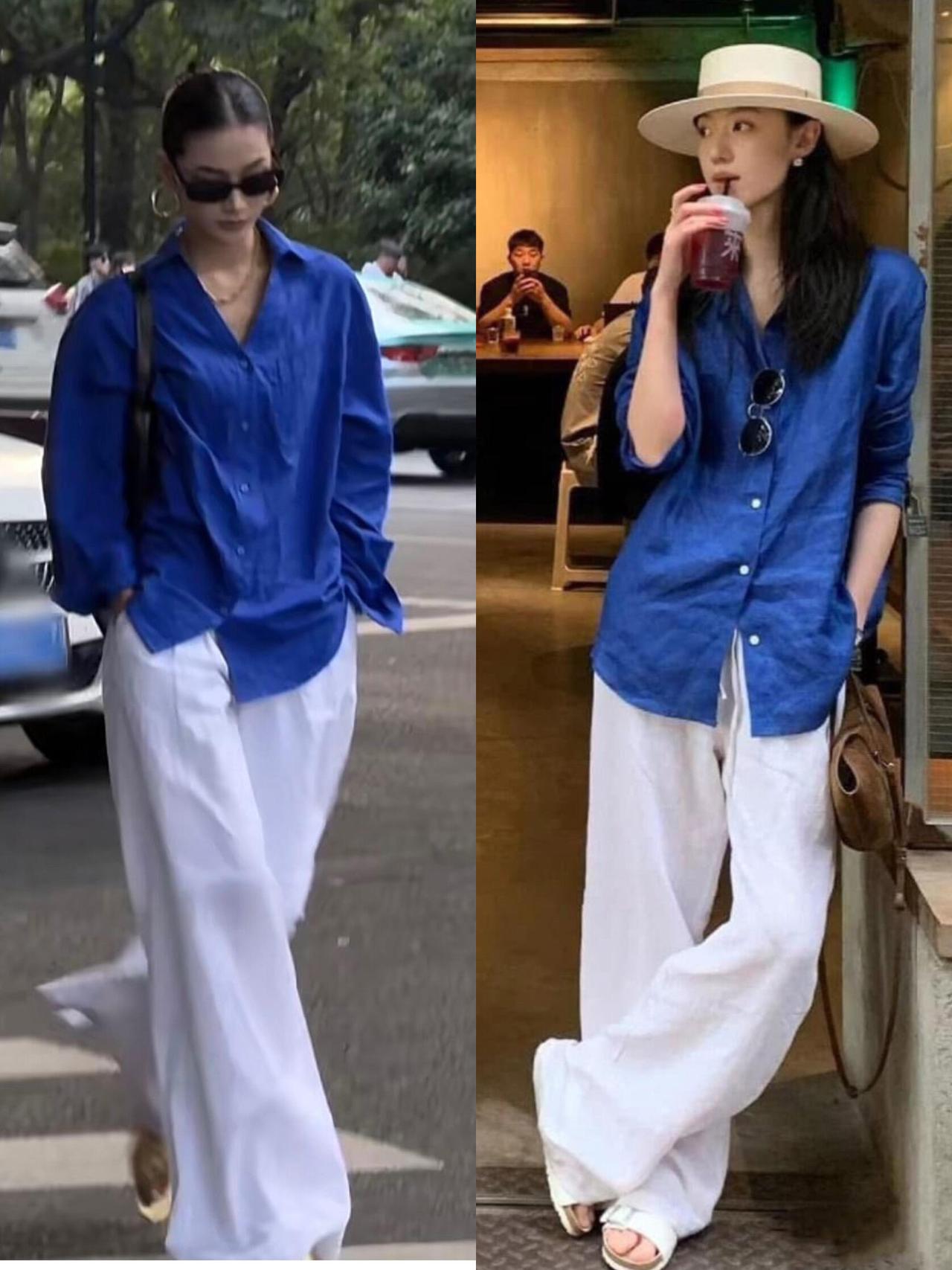 蓝色衬衫的时尚感被低估了,配阔腿裤很有气质!亮眼的克莱因蓝自带清爽气场,搭配黑色