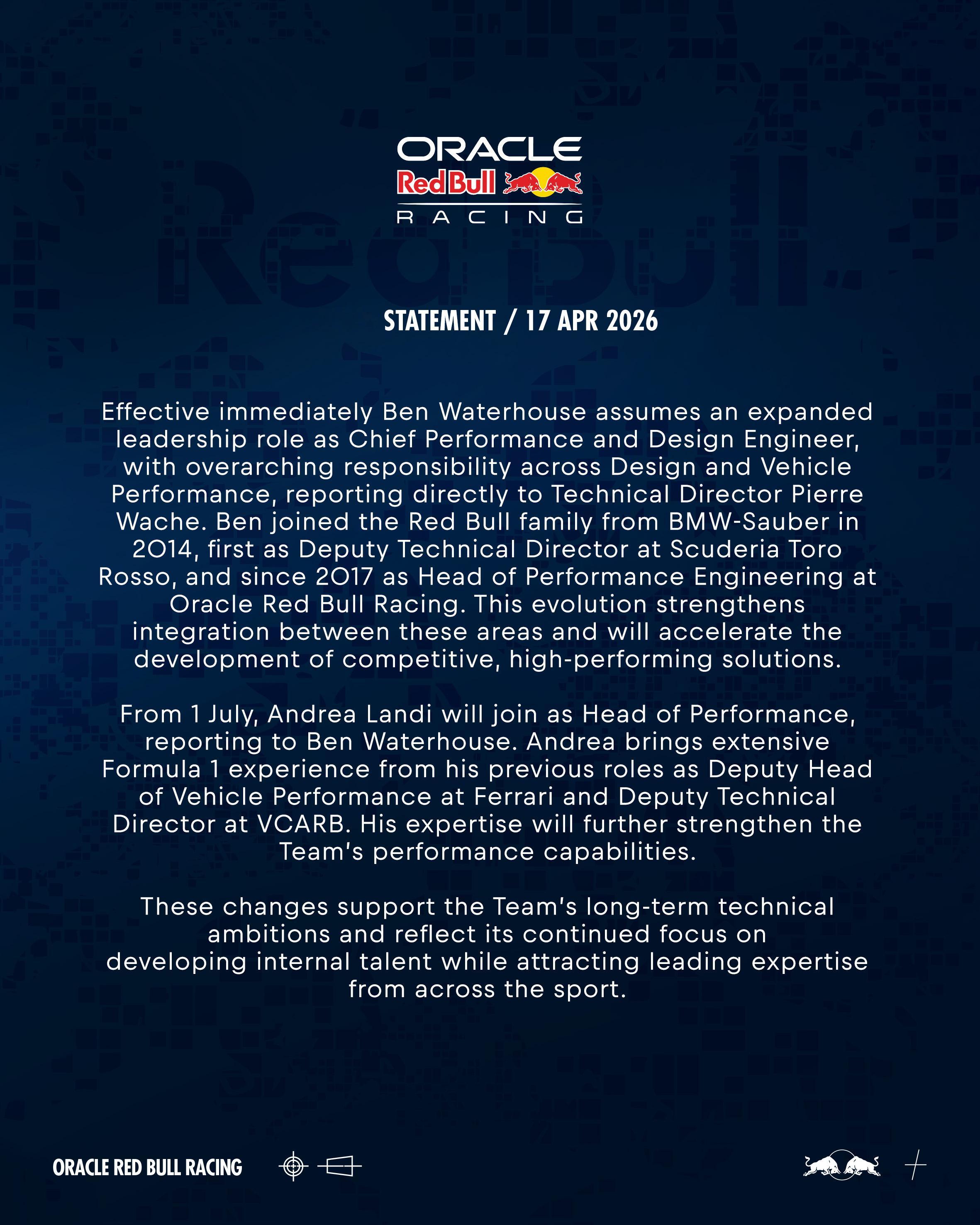 红牛车队官方声明:即日起,本・沃特豪斯升任首席性能与设计总工程师,全面统管赛车设计与车辆性能两大板块,直接向技术总监皮埃尔・瓦且汇报。