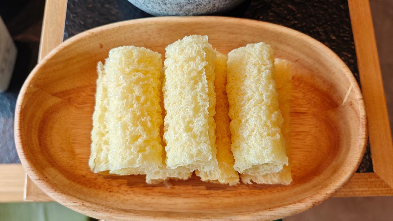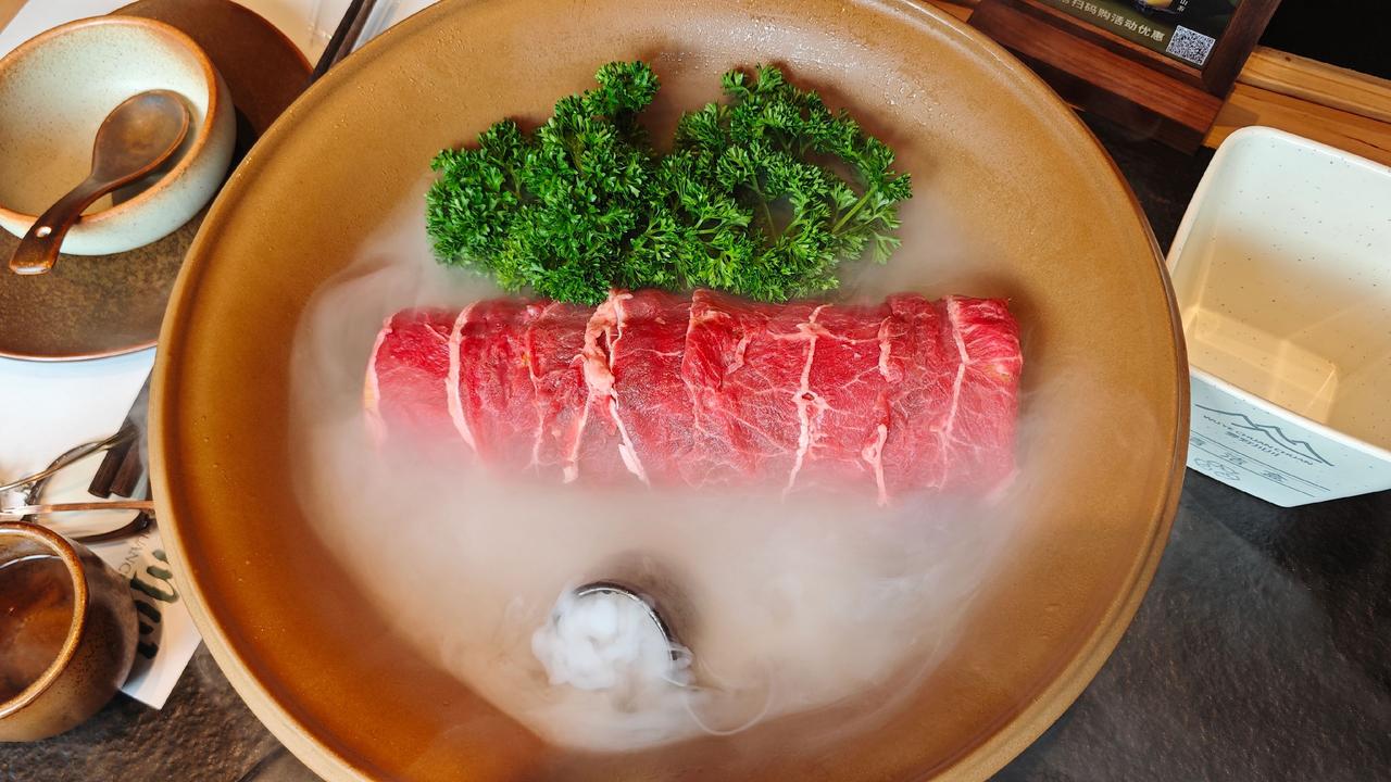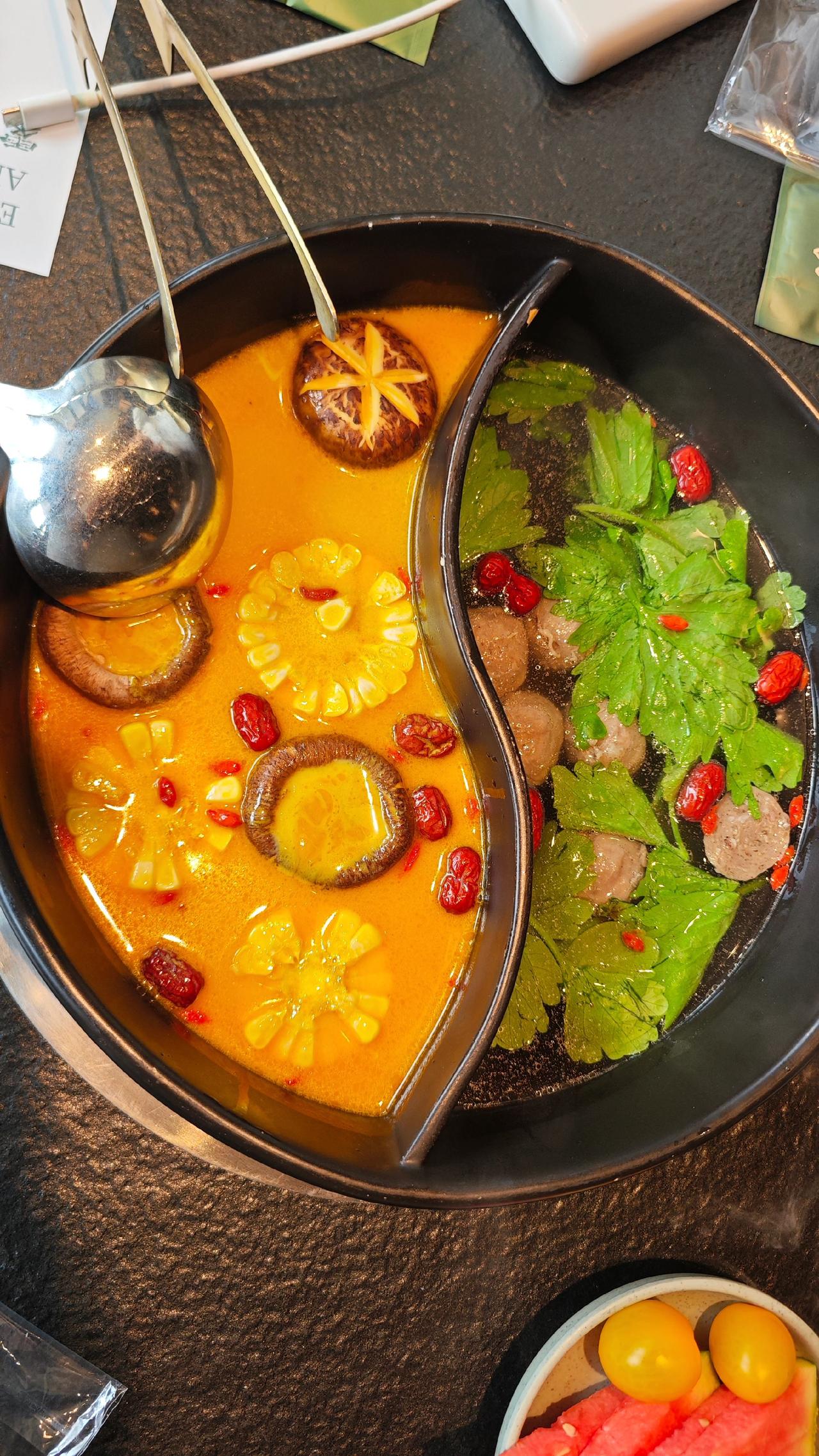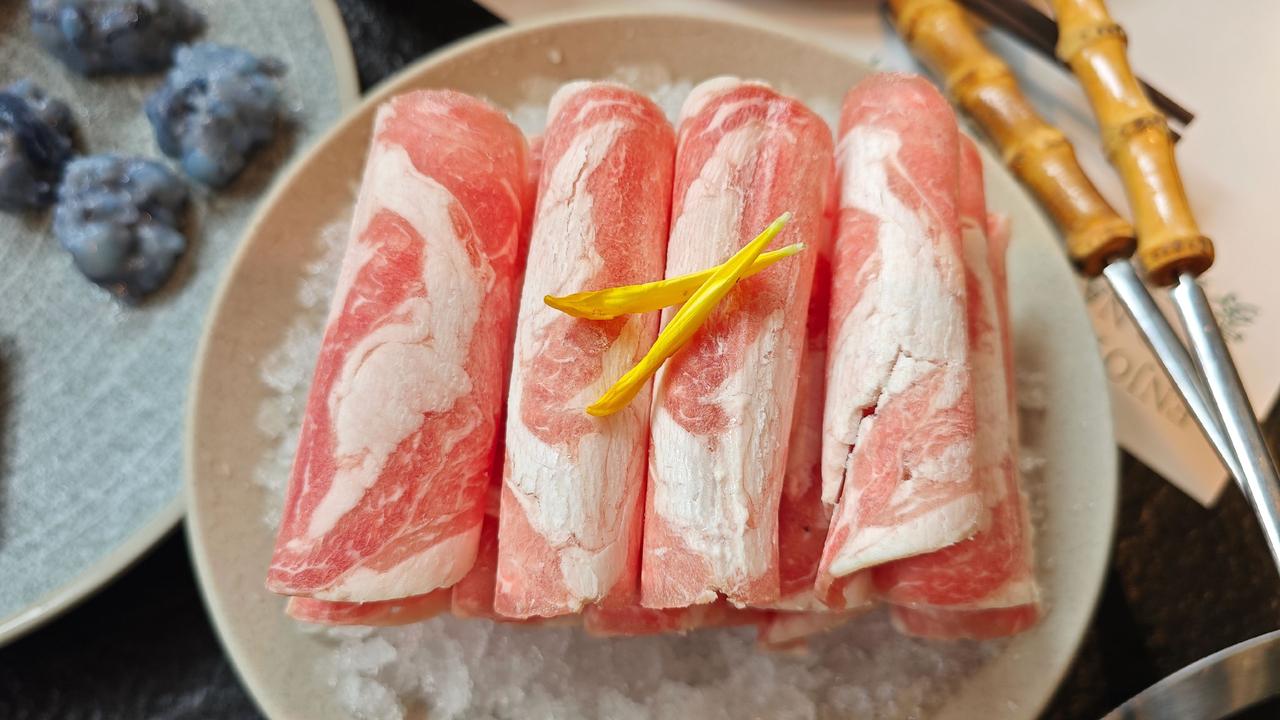 点上牛油辣锅和菌汤的双拼,一边是川渝的热烈奔放,干辣椒与花椒在牛油里熬出醇厚香气,是码头文化里的豪爽直接;一边是山野的清鲜,多种菌子慢炖出的鲜甜,像盛泽湖荡里的温润柔和。现切的9秒牛肉纹路漂亮,在辣锅里轻晃几秒便熟,嫩得能掐出水,蘸上蒜泥香油,一口下去满是满足。毛肚要七上八下,脆弹爽口,是川味火锅里的老讲究,每一口都是对火候的精准拿捏。