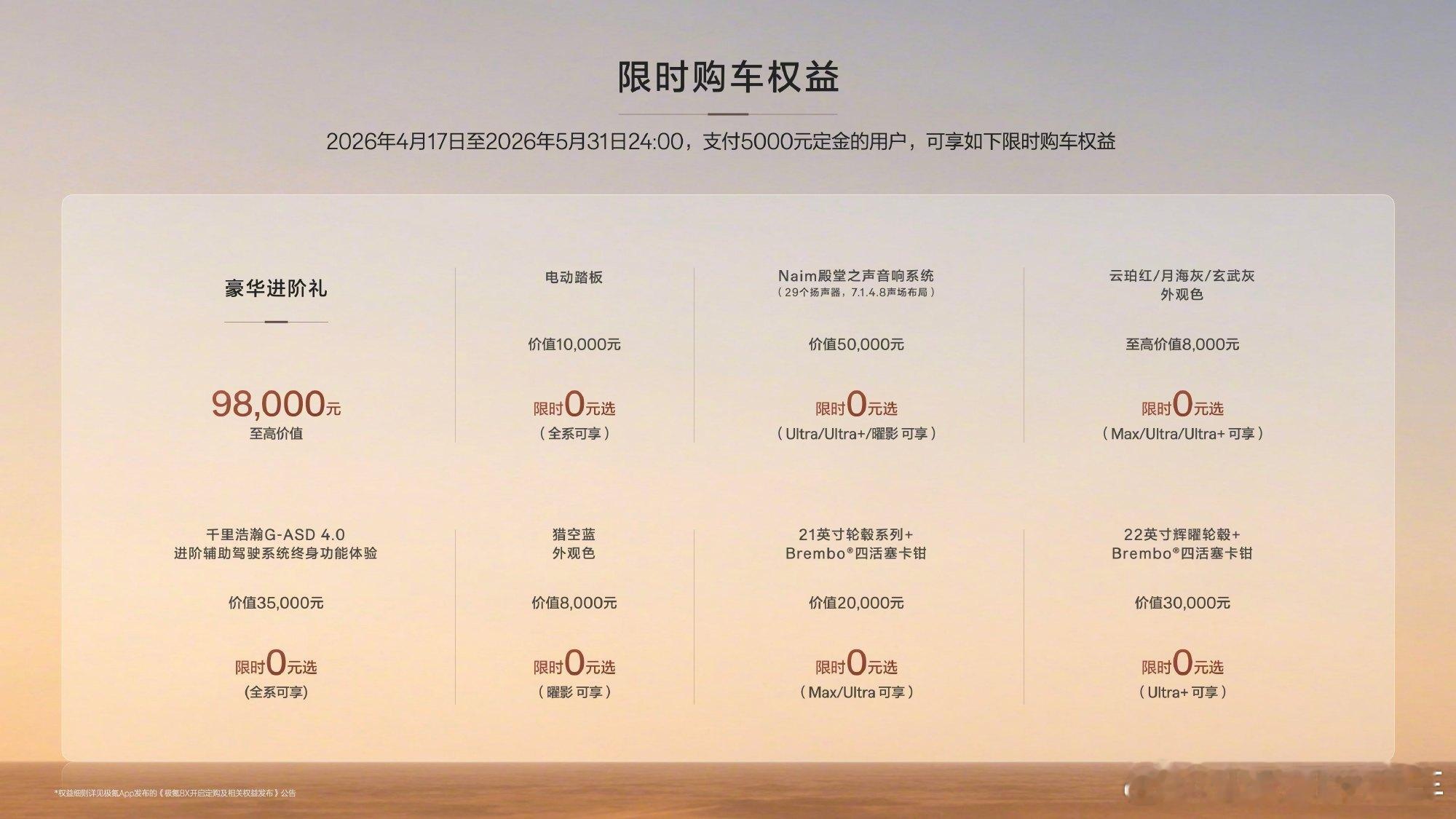 AI数字底盘、双腔空悬加电磁减振,再加上高强度车身与一体式压铸工艺,操控与安全双双拉满。车内大五座布局宽敞舒适,双8295芯片加持智能座舱,高阶智驾方案算力最高1400TOPS,科技体验一步到位。这车的外观非常加分,目前订车权益给的很足的。