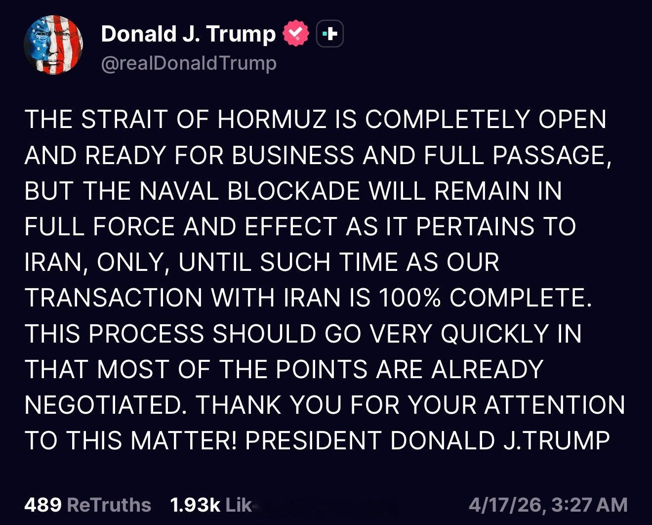 “霍尔木兹海峡目前完全开放,随时欢迎商业往来和自由通行,但针对伊朗的海军封锁将保持全面有效,直至我们与伊朗的交易100%完成为止。鉴于大部分条款已达成协议,这一进程应能迅速推进。谢关!”