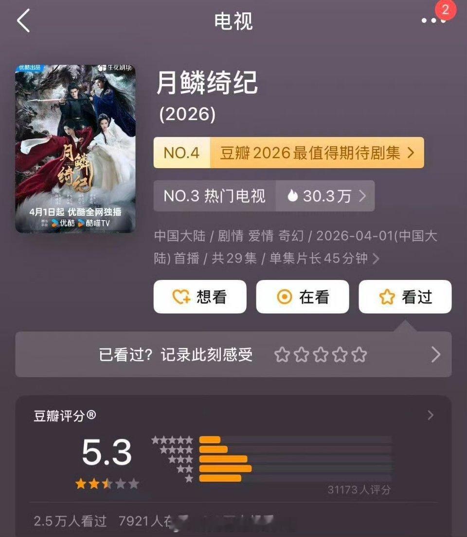 近期新剧豆瓣开分,谁高了谁低了?《白日提灯》评分6.7,8.1万人评分《月鳞绮纪》评分5.3,3.1万人评分《钢铁森林》评分6.8,1.2万人评分《冰湖重生》评分3.2,0.8万人评分月鳞绮纪豆瓣5.3 白日提灯豆瓣6.7 冰湖重生豆瓣3.2