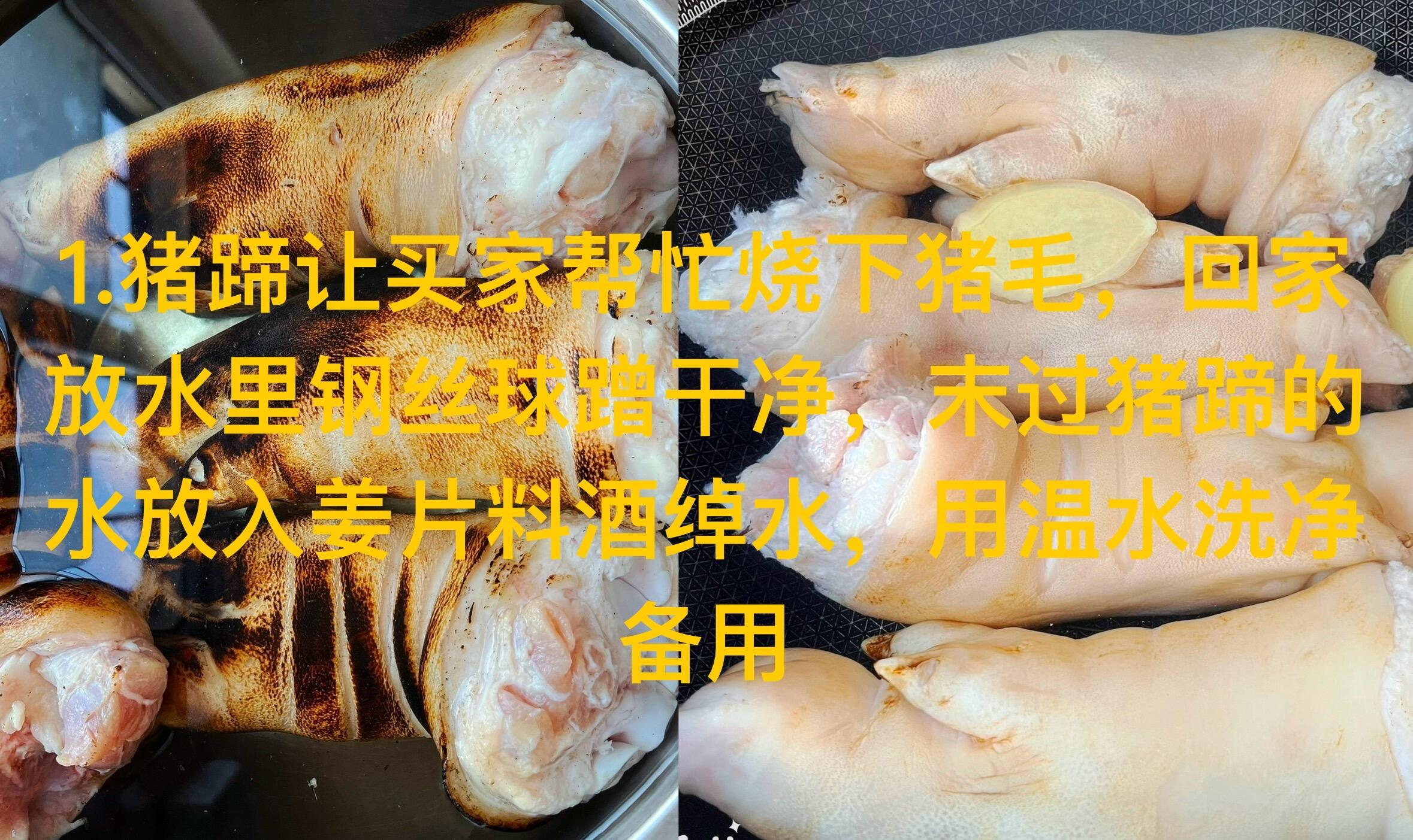 让买家帮忙烧一下猪毛,回家后放清水里,用钢丝球仔细蹭干净,去除残留杂质。接着往锅里加没过猪蹄的水,放入姜片和料酒,焯水后捞出,用温水冲洗干净备用